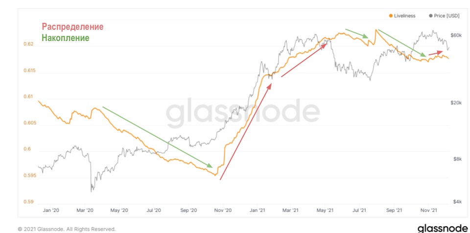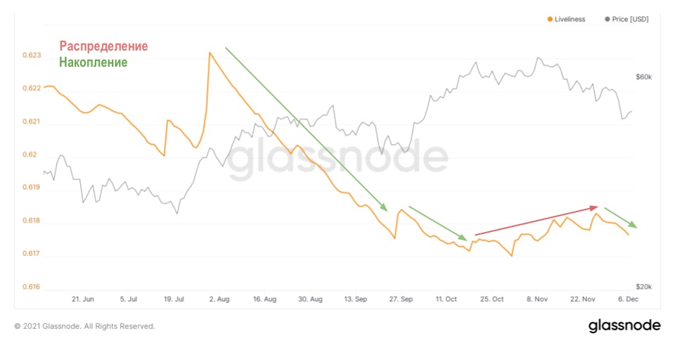 Вернемся к полезной ончейн-метрике, Liveliness (коэффициент «живости»), помогающей отслеживать тенденции накопления и распределения монет ходлерами.