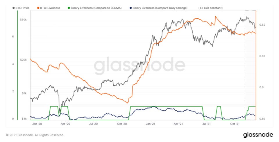 - Liveliness уменьшается, когда долгосрочные держатели аккумулируют больше монет, уменьшая количество разрушаемых койн-дней по отношению к создаваемым.