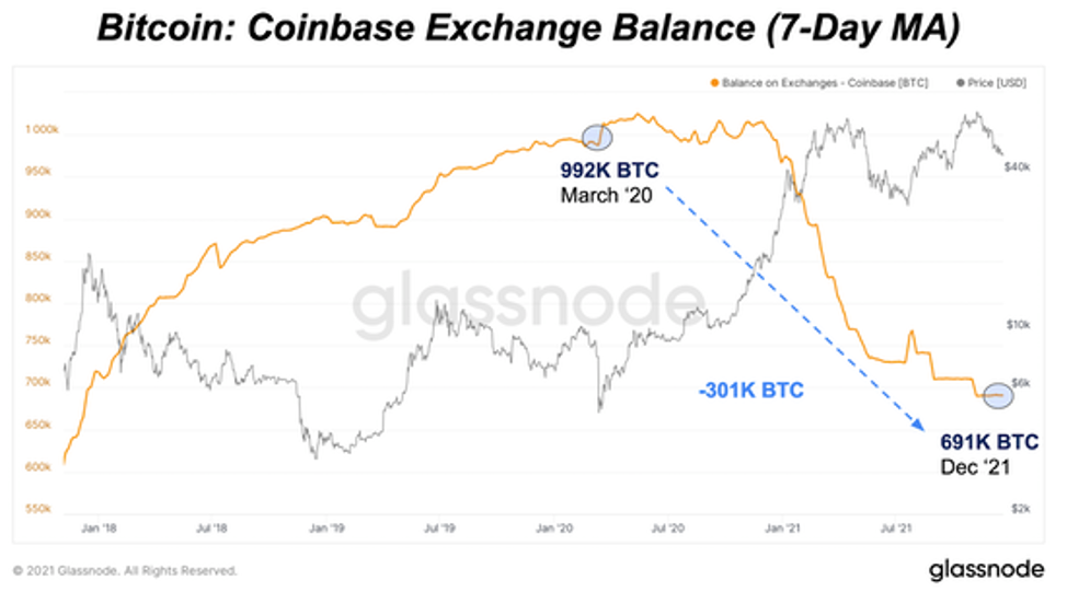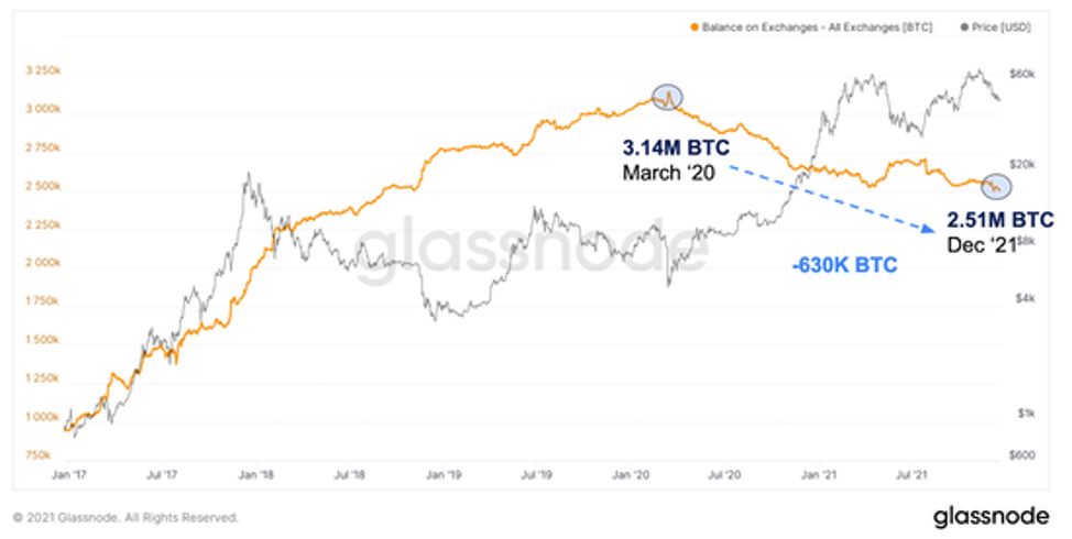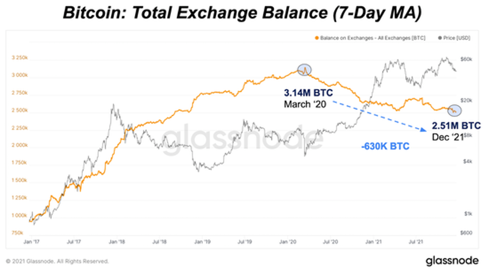 Одним из наиболее интересных ончейн-трендов за последние два года является изменение тренда биржевых балансов. С марта 2020 года общие балансы на биржах сократились почти на 20% или на 630 тыс. BTC. Как правило, биткойн, покидающий биржи, является бычьим макроиндикатором цены и принятия, поскольку это означает, что количество BTC, которое можно быстро продать или обменять на рынке, стало меньше.