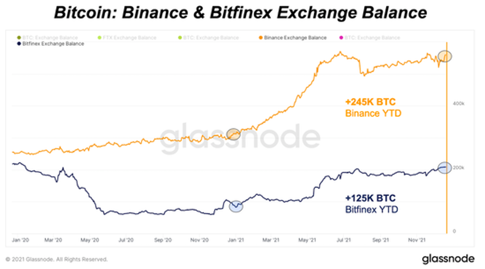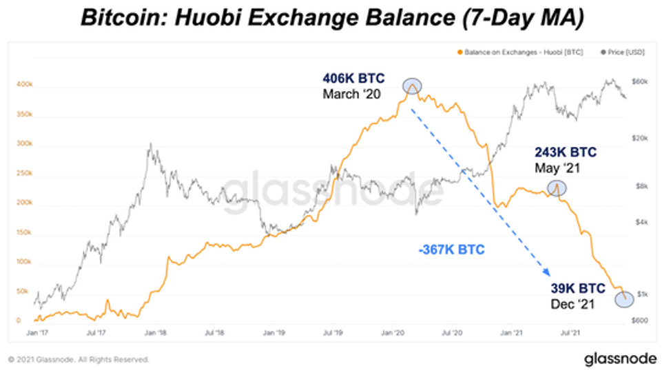 В результате ключевым фактором падения общего биржевого баланса в этом году стала крупнейшая китайская биржа Huobi. С марта 2020 года баланс BTC на Huobi сократился на 84%, при этом в последние несколько месяцев это снижение было связано с закрытием Huobi деятельности в Китае. Это вынуждает пользователей либо продавать свои позиции, либо выводить BTC и перемещать куда-то еще.