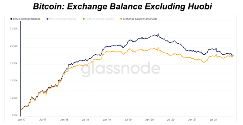 Тем не менее, ключевой макронарратив в отношении того, что биткойн покидает биржи и, вероятно, оседает в холодных кошельках, остаётся в силе с марта 2020 года. Без учета Huobi общие биржевые балансы по-прежнему имеют тенденцию к снижению.