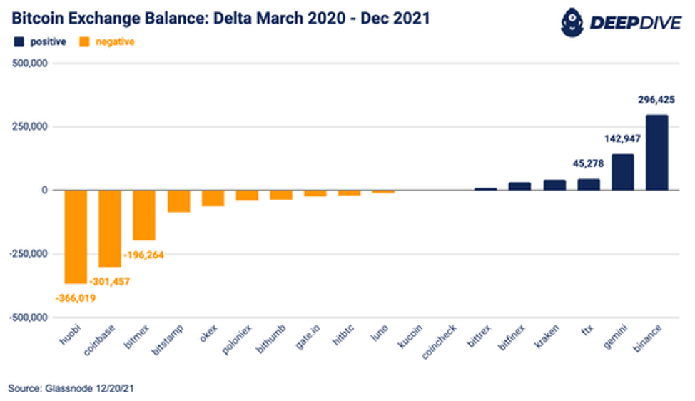Вот визуализация изменения или разницы биржевых балансов с марта 2020 года по настоящее время. Huobi, Coinbase и Bitmex были главными источниками оттока капитала, в то время как FTX, Gemini и Binance испытали наибольший приток.