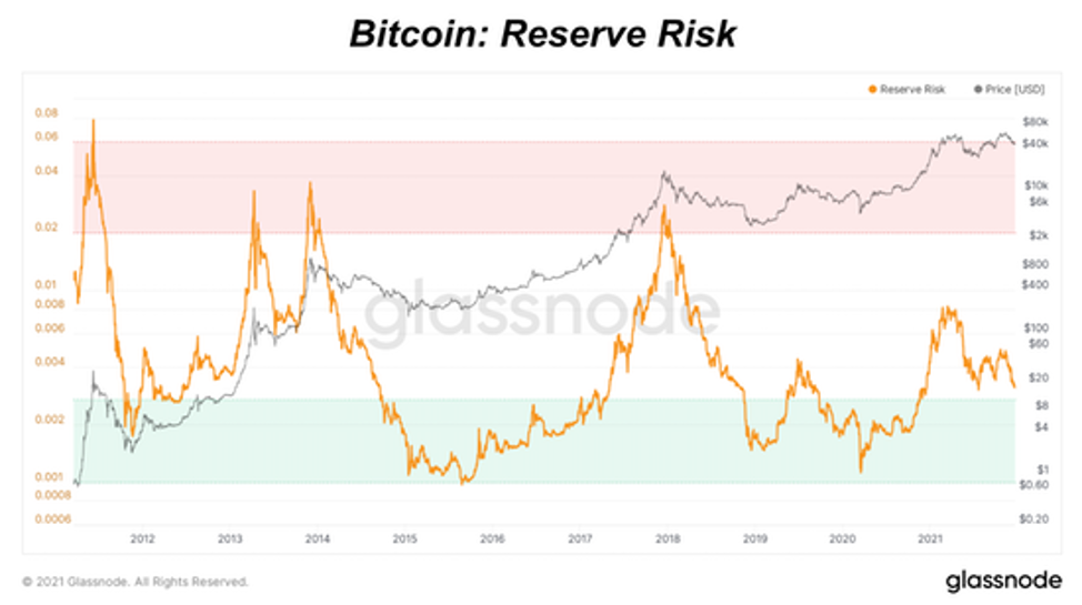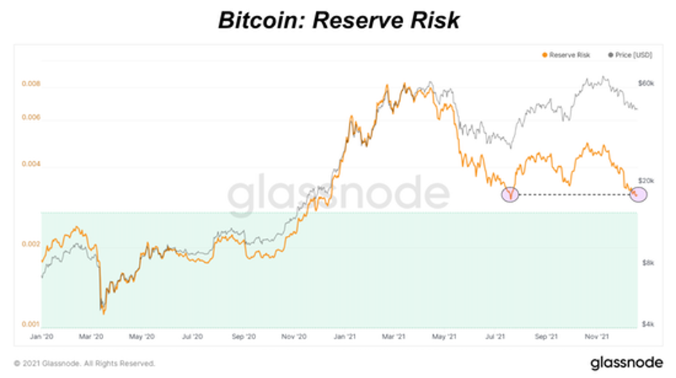 В связи с текущими трендами ончейн-накопления в сочетании с медвежьим ценовым движением, риск резерва снизился до уровня, на котором он находился на дне рынка ниже $30 тыс.