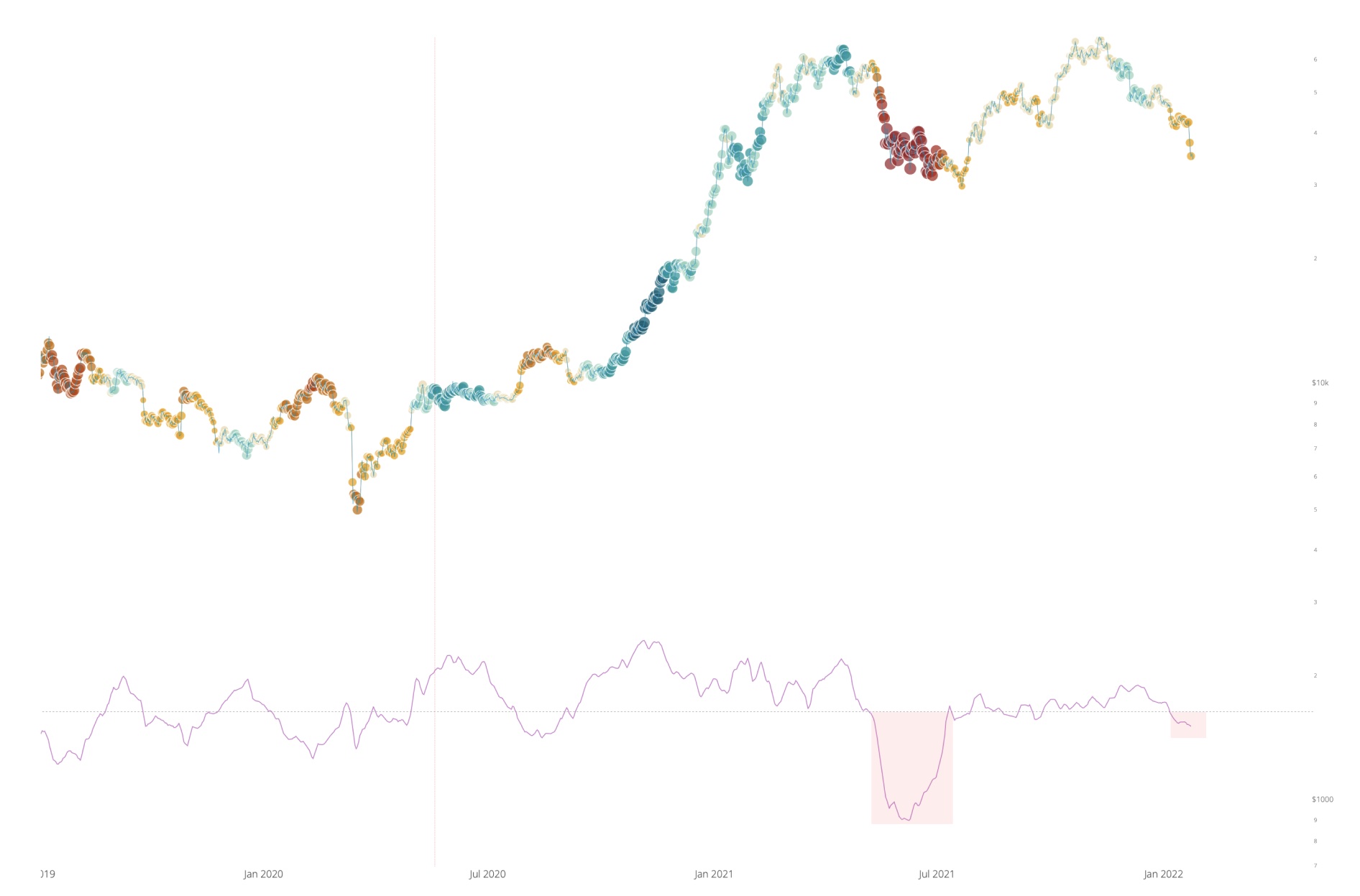 Это подводит меня к мысли о том, что рынок находится в зоне повторного накопления. В последний раз, находясь в этой фазе (с середины 2019 по конец 2020 г.), BTC торговался в сильнейшей корреляции с рынком акций. Ончейн-анализ был почти бесполезен в прогнозировании краткосрочных движений цены, хоть и показал надвигающийся шок предложения, за счет которого и была в итоге нарушена корреляция.