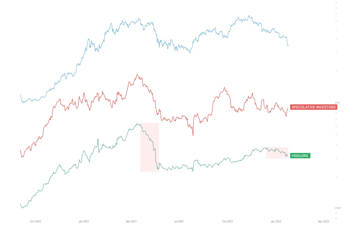 Нынешние значения этого графика чистого перетока монет между ходлерами и спекулянтами я нахожу довольно интересными. Я отметил на нем, насколько сильную распродажу мы наблюдали в мае – июне 2021 года. Сейчас мы наблюдаем коррекцию аналогичного масштаба, однако фактические продажи со стороны ходлеров по сравнению с тем периодом невелики.