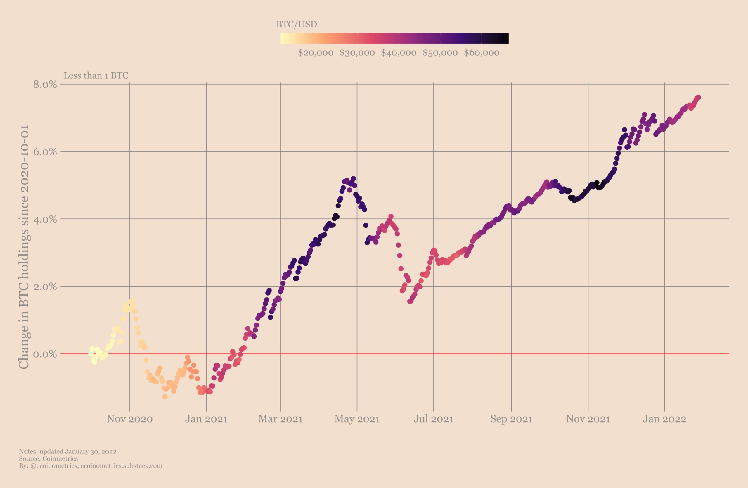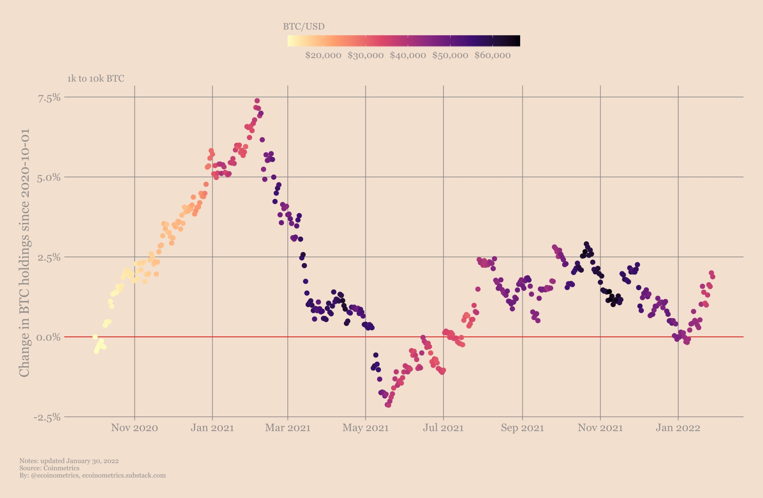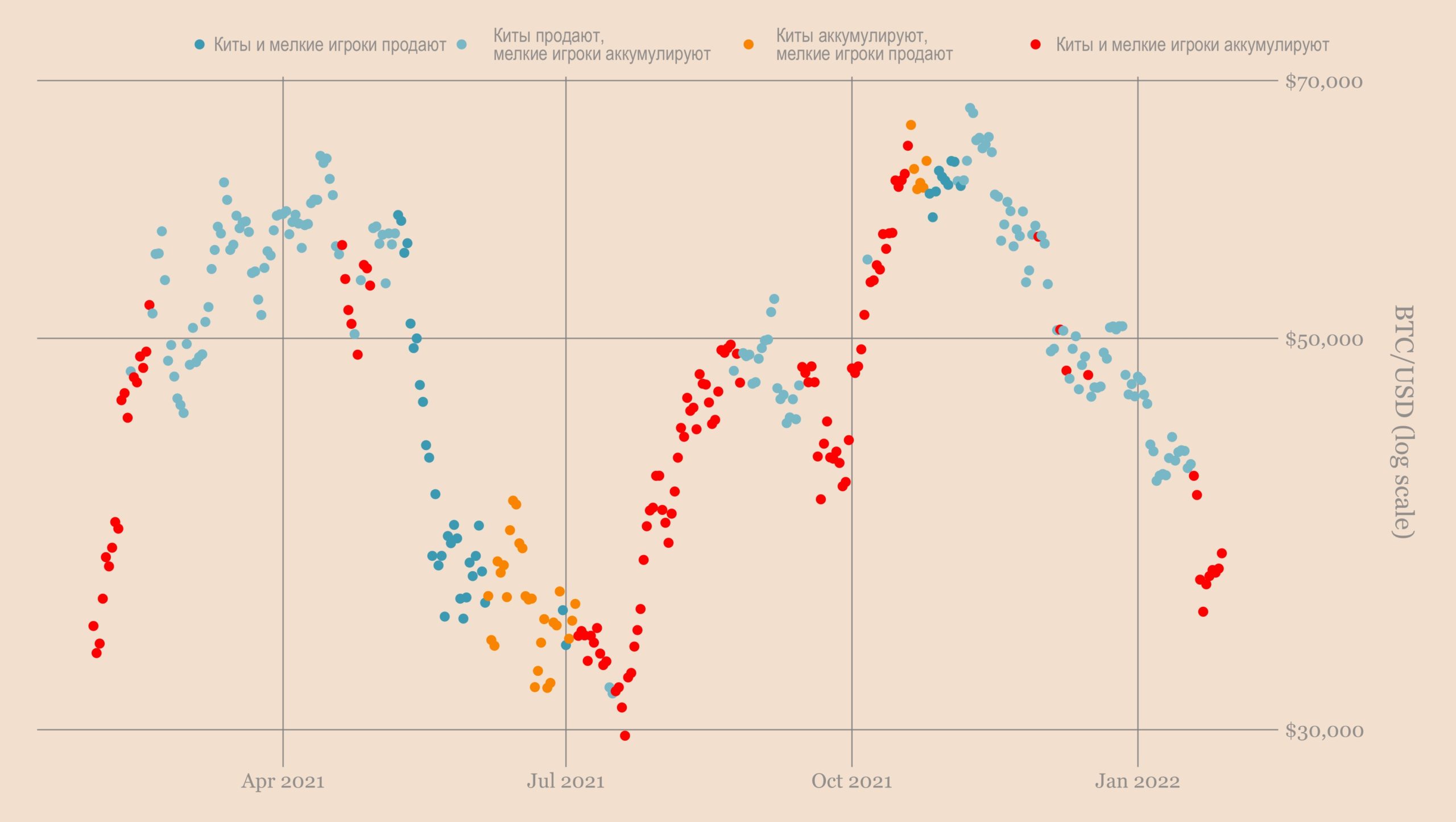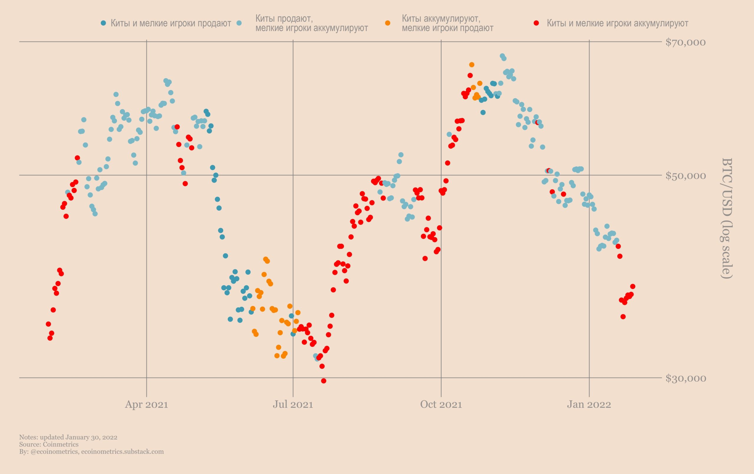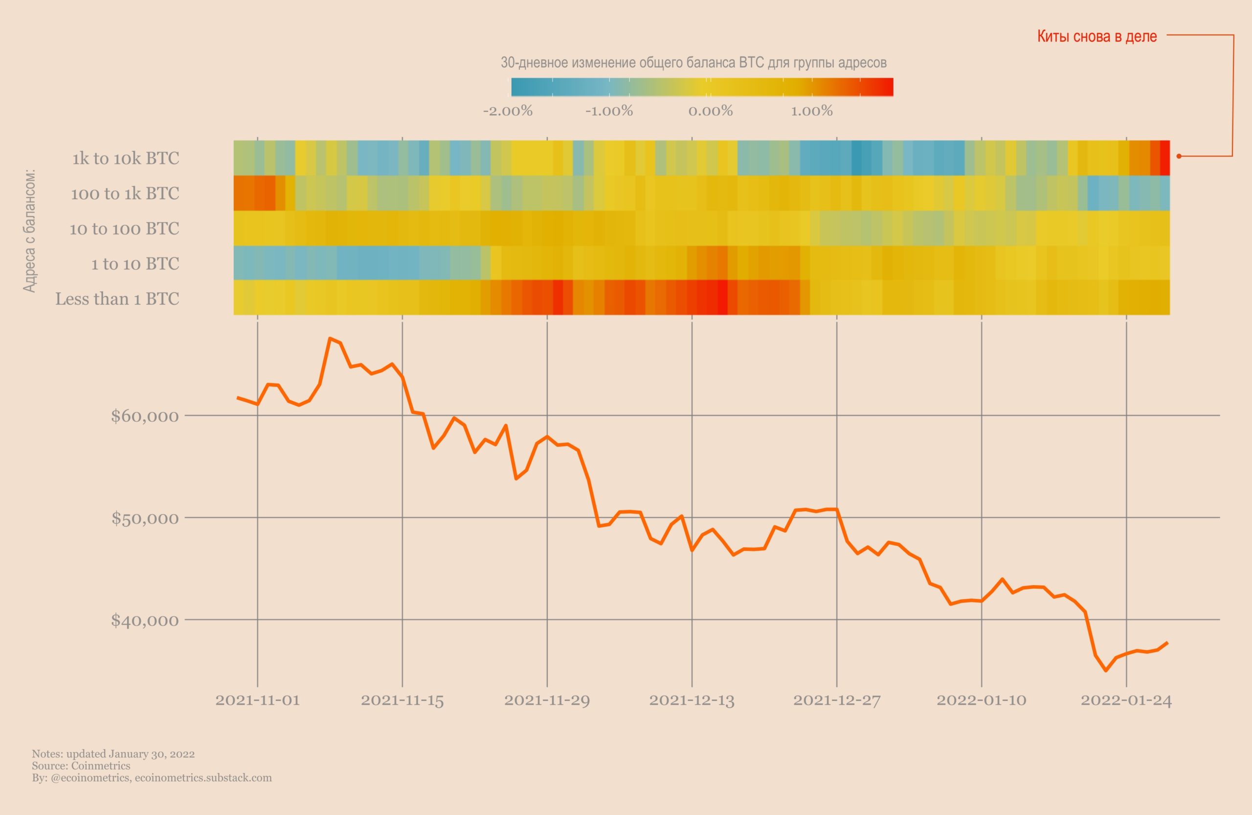 Киты также показывают самый сильный паттерн накопления со времен восстановления от дна летом 2021 года. Интересно, что как дно мая – июля 2021, так и текущее дно в паттернах накопления, произошли примерно на одних и тех же ценовых уровнях.
