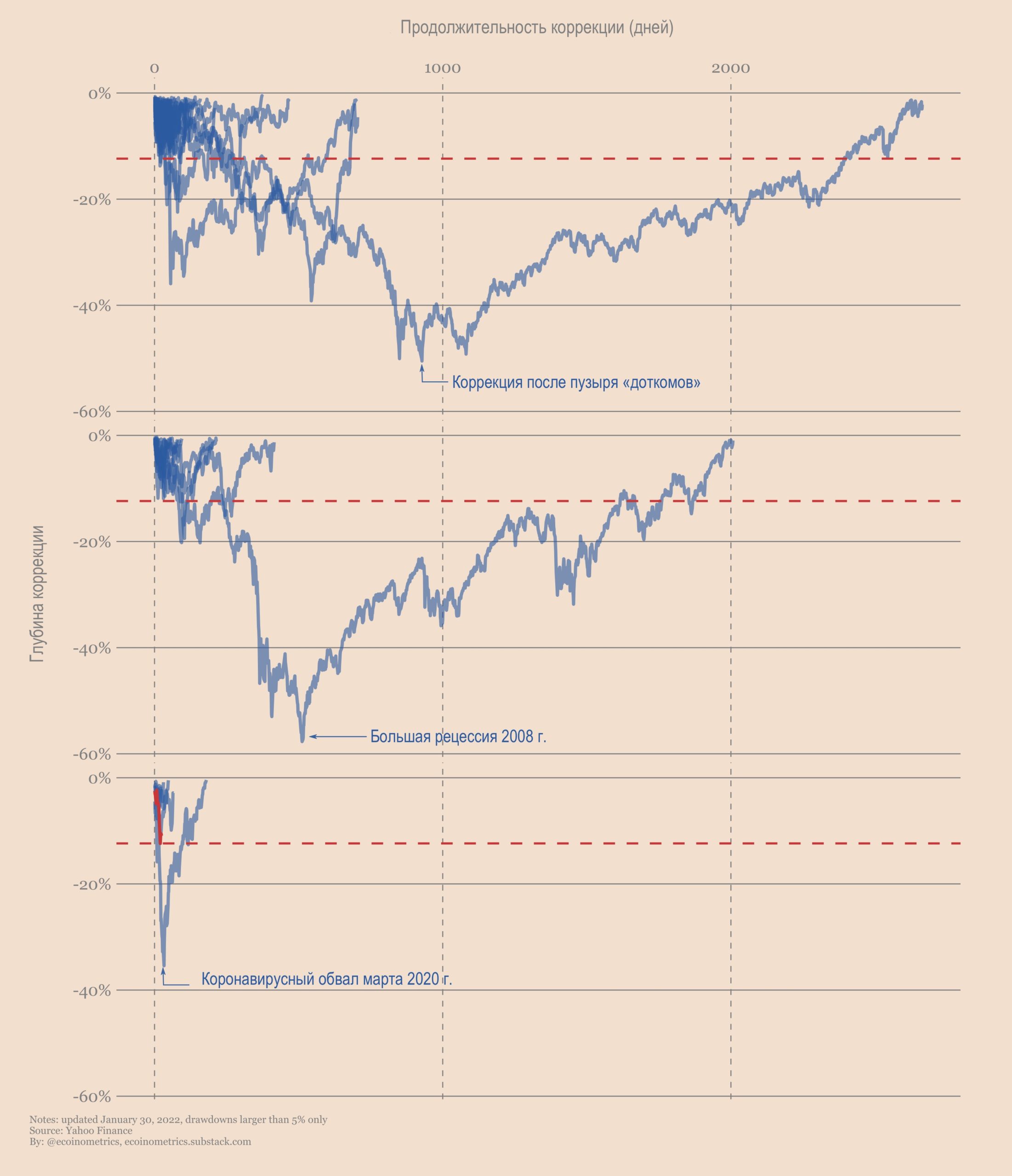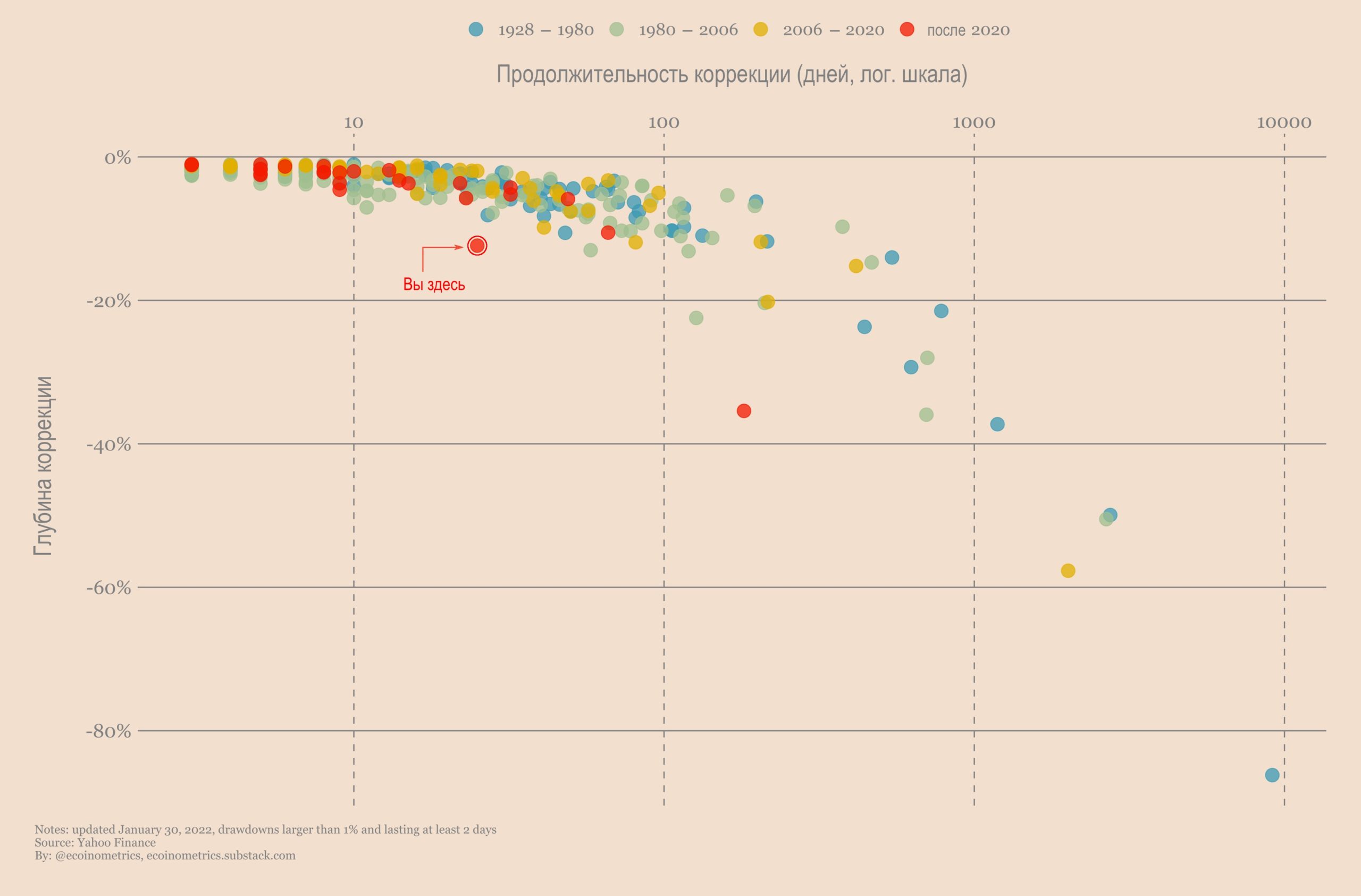 Обычно продолжительность коррекций фондового рынка в диапазоне -12% составляет от месяца до года. Но, по крайней мере, можно пока успокаивать себя тем, что с точки зрения глубины нынешняя просадка находится в той точке, где большинство коррекций останавливаются.