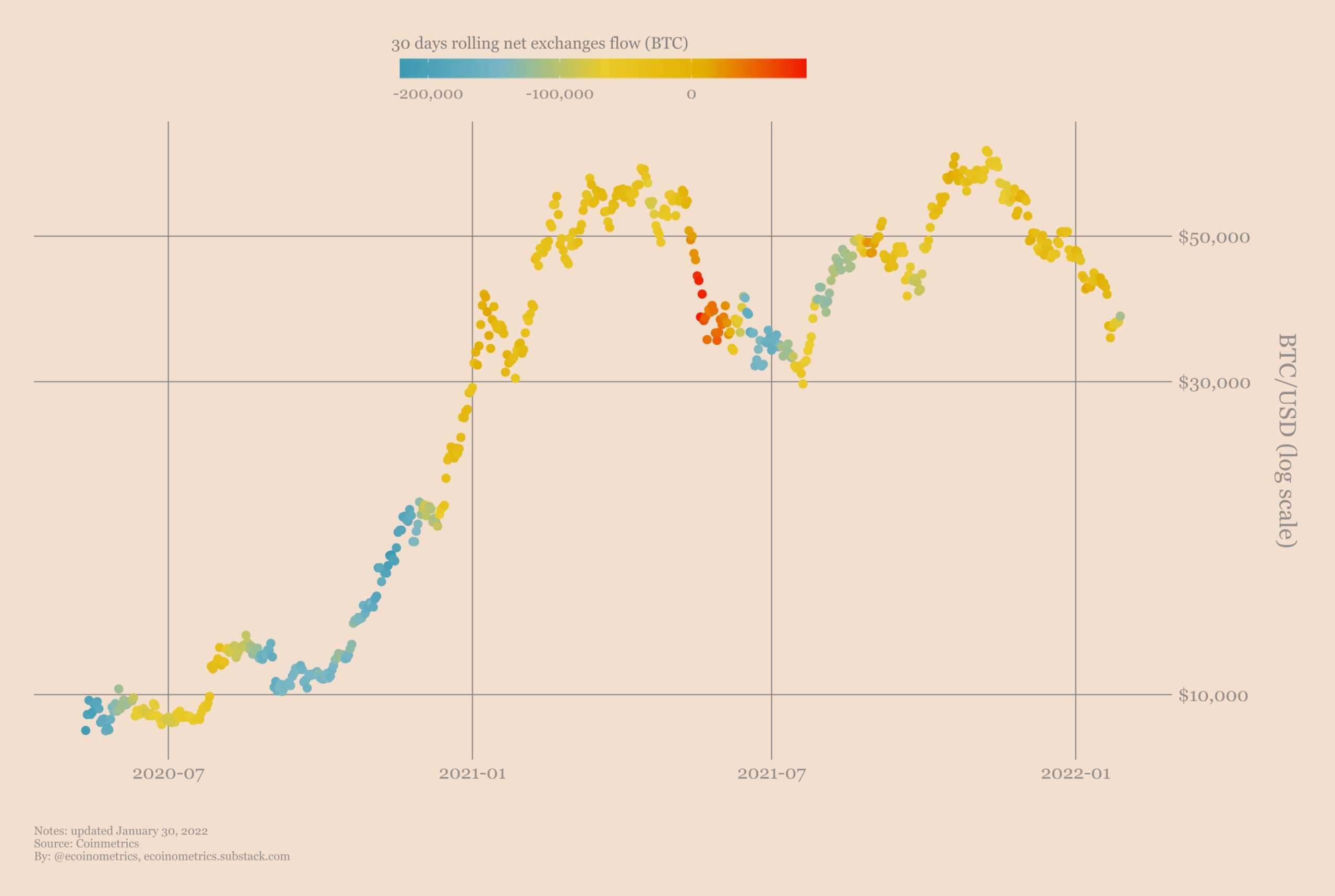 Первый видимый признак состоит в том, что за последние 30 дней в среднем мы снова наблюдаем большой отток монет с бирж. Показатель быстро вырос от 0 до более чем 100 тыс. BTC, выведенных с биржевых адресов в течение месяца.