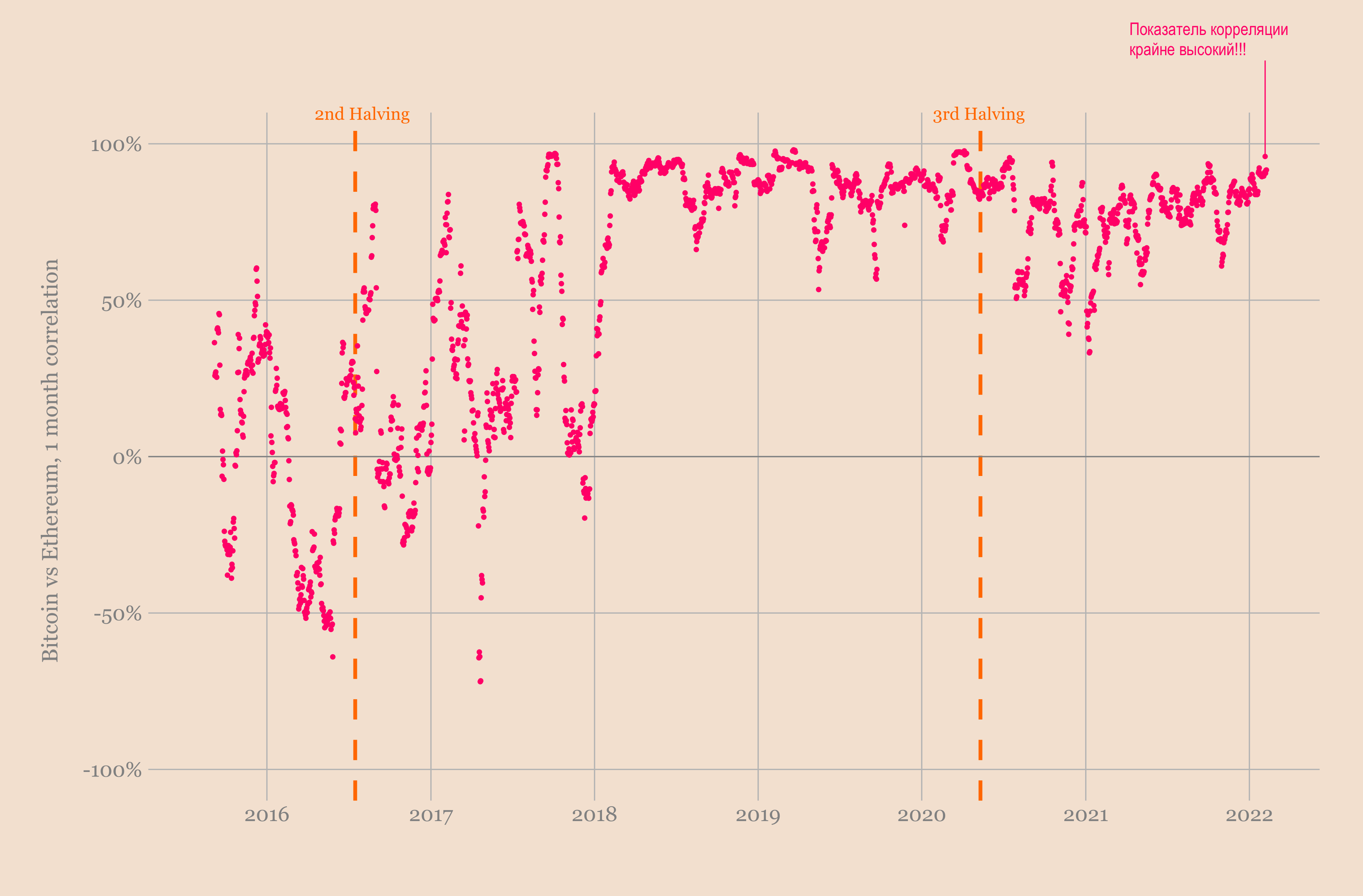 На самом деле это неудивительно, когда вы понимаете, что после медвежьего рынка второго халвинга биткойна месячная корреляция ежедневной доходности BTC и ETH в среднем превысила 75%…