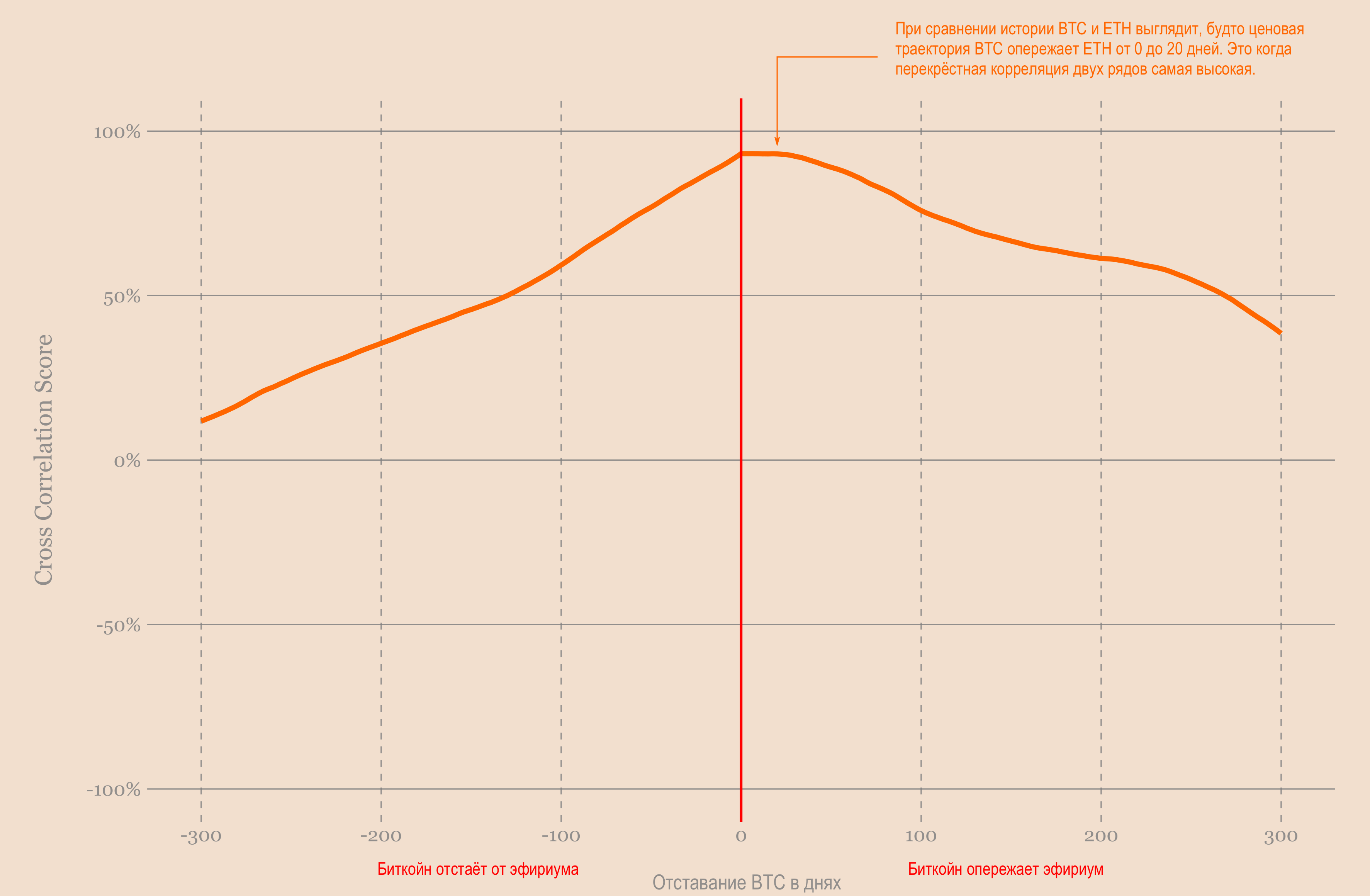 Если, скажем, корреляция траектории цены BTC с задержкой в 10 дней больше или равна траектории цены BTC с задержкой в 0 дней, то это намёк на то, что движение биткойна 10-дневной давности коррелирует с текущим движением ETH.
