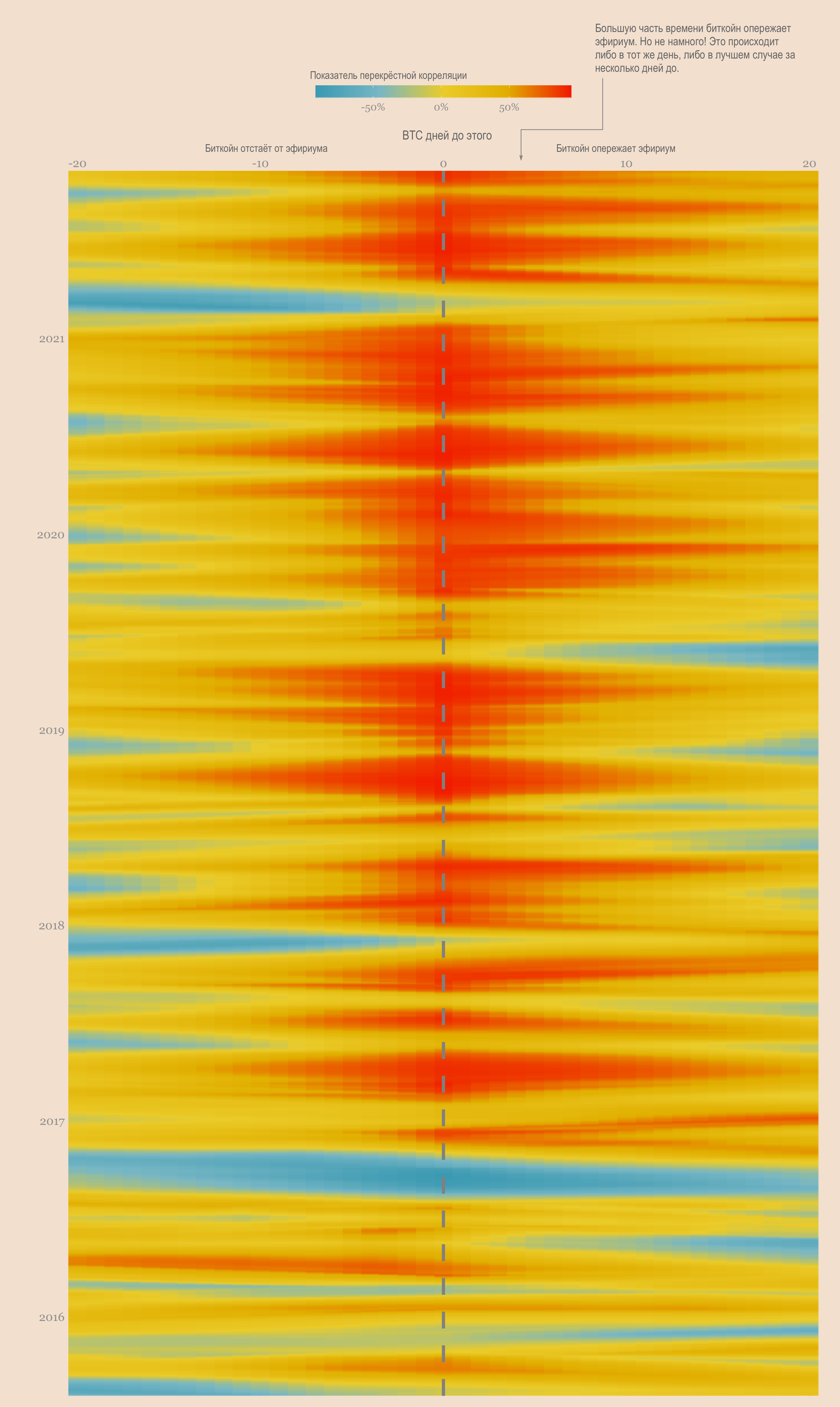- По горизонтальной оси указано количество дней, в течение которых смещается траектория цены биткойна. Положительные значения — это когда биткойн опережает эфириум. Отрицательные — когда эфириум опережает биткойн.