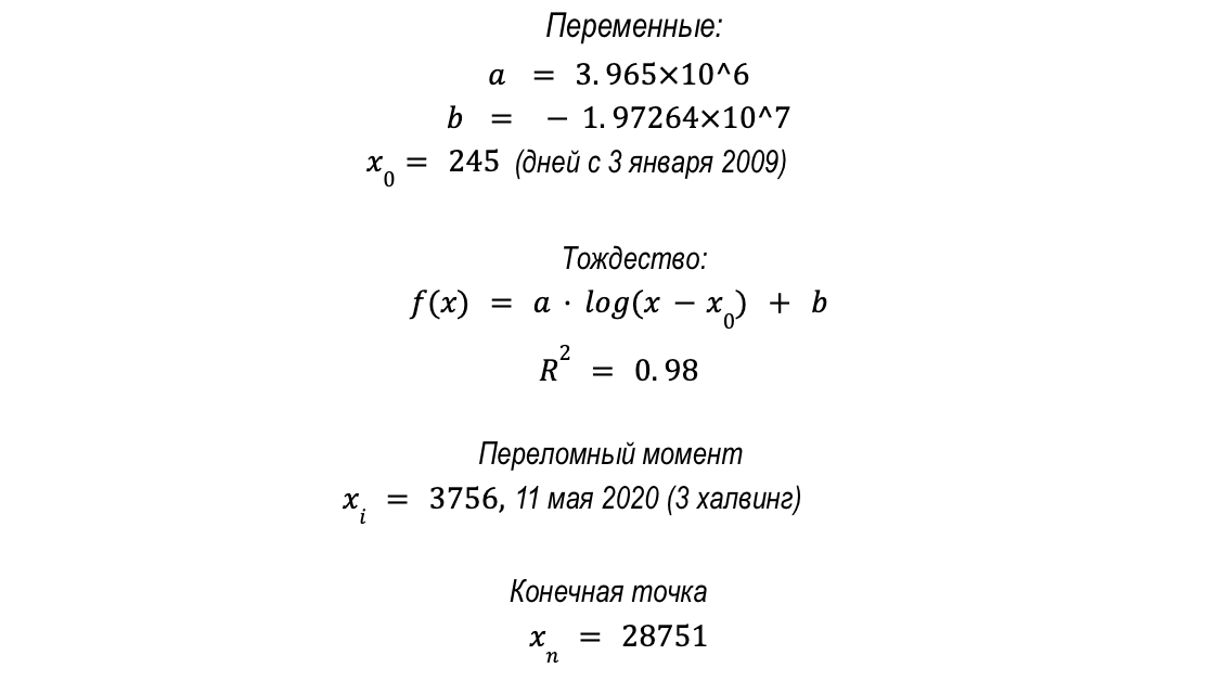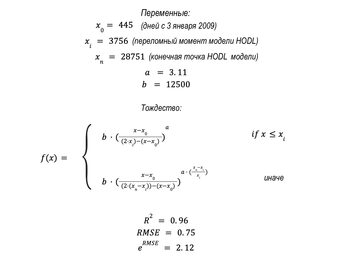 Было проделано мало работы, чтобы смоделировать, как могут выглядеть будущие рыночные последствия растущей доли неликвидного предложения в циркулирующем предложении. Модель HODL направлена на то, чтобы сделать это с помощью логарифмического уравнения, определяя переломный момент, когда рост неликвидного предложения начал опережать рост эмиссии. Уравнение продемонстрировано ниже: