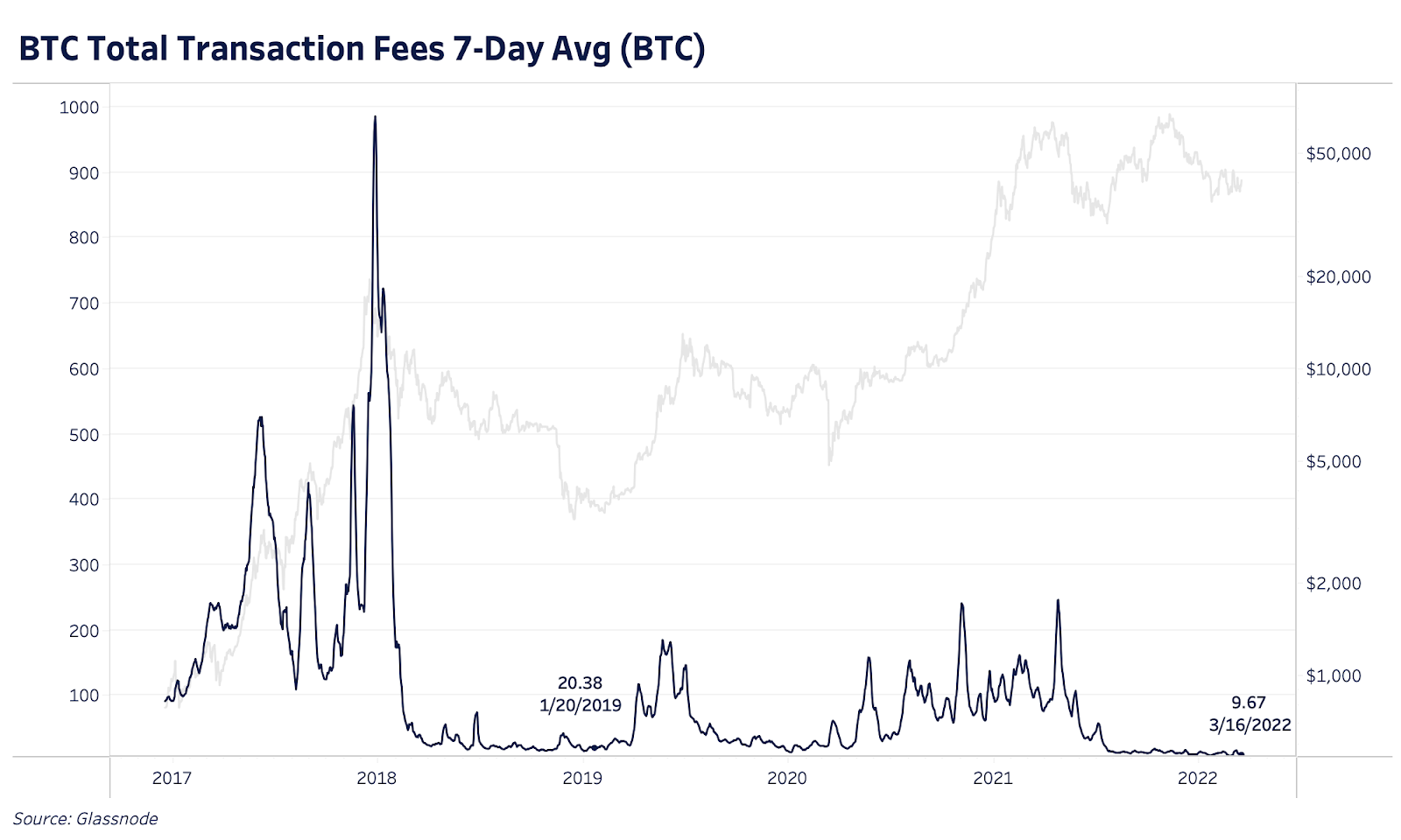 Недавний рост пропускной способности публичного канала особенно впечатляет, если принять во внимание рыночную конъюнктуру комиссий в BTC, которые были чрезвычайно низкими с осени 2021 года (в пересчёте на BTC).