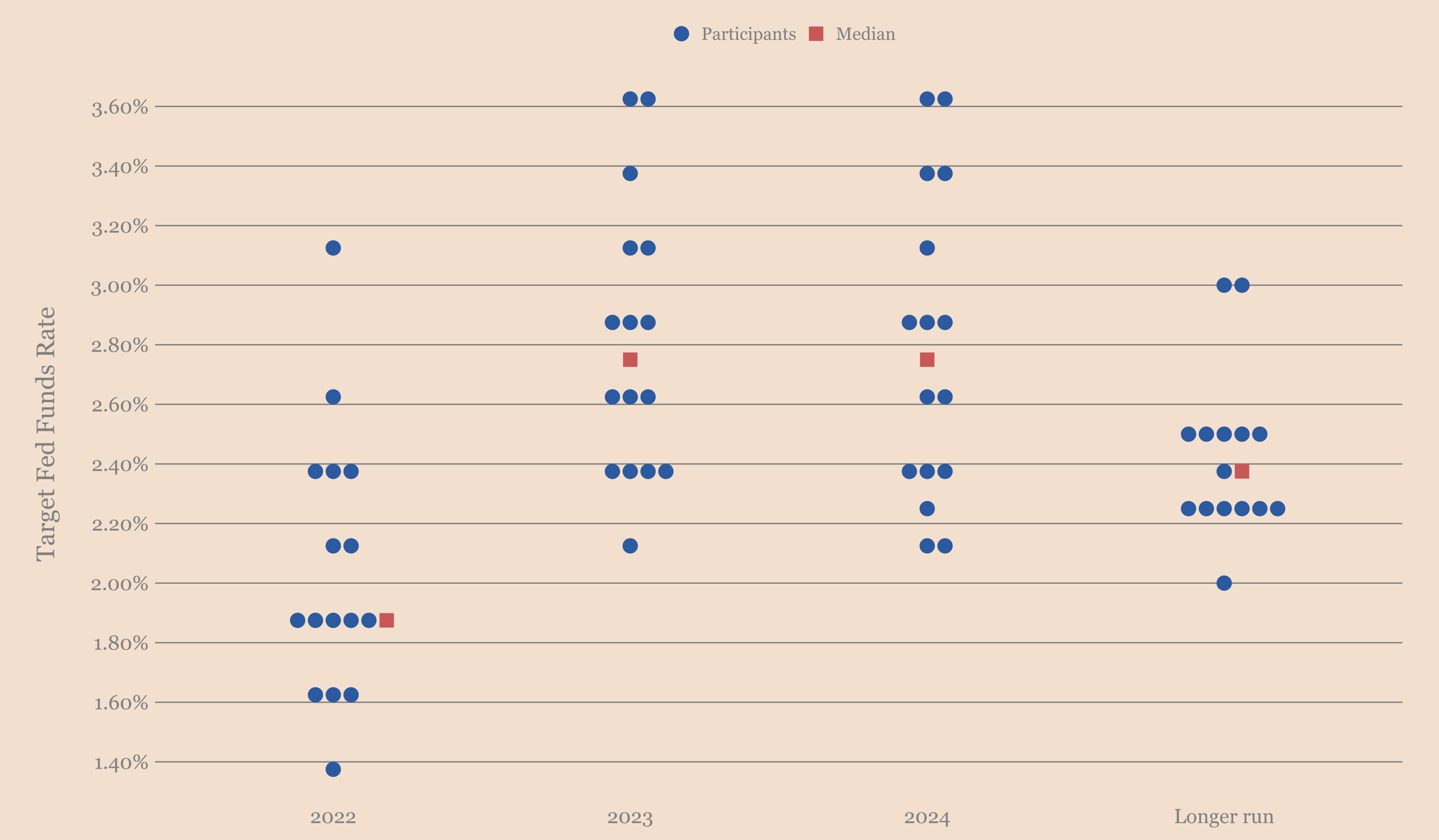 Точечная диаграмма предполагает, что ФРС серьёзно относится к делу. Если помните, члены FOMC голосуют за прогнозируемые ставки на разных временных горизонтах. Каждая точка на приведённой ниже диаграмме соответствует одному голосу за ставку в каждом периоде времени. Медиана этих голосов (выделена красным цветом) — это то, что я принимаю за консенсус за этот период.