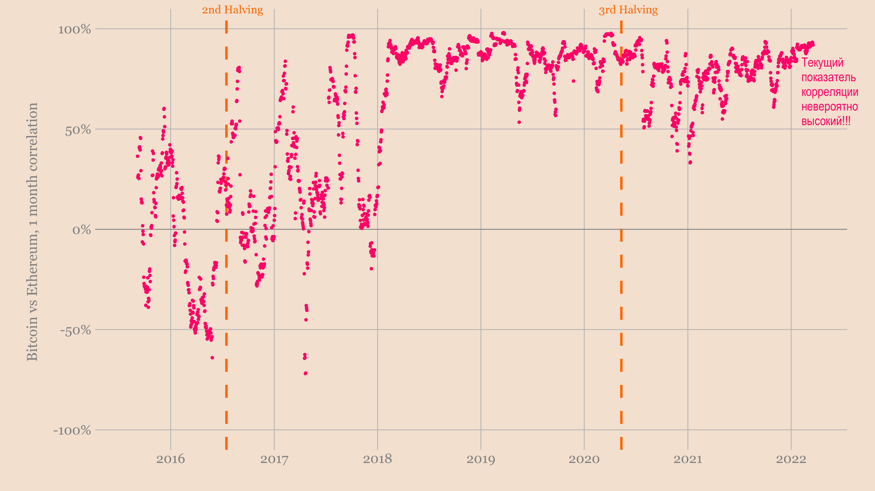 Нет абсолютно никаких признаков того, что эфириум отделяется от биткойна. На сегодняшний день показатель корреляции между ETH и BTC составляет практически 100%. Так что не похоже, что эти двое движутся по разным траекториям.