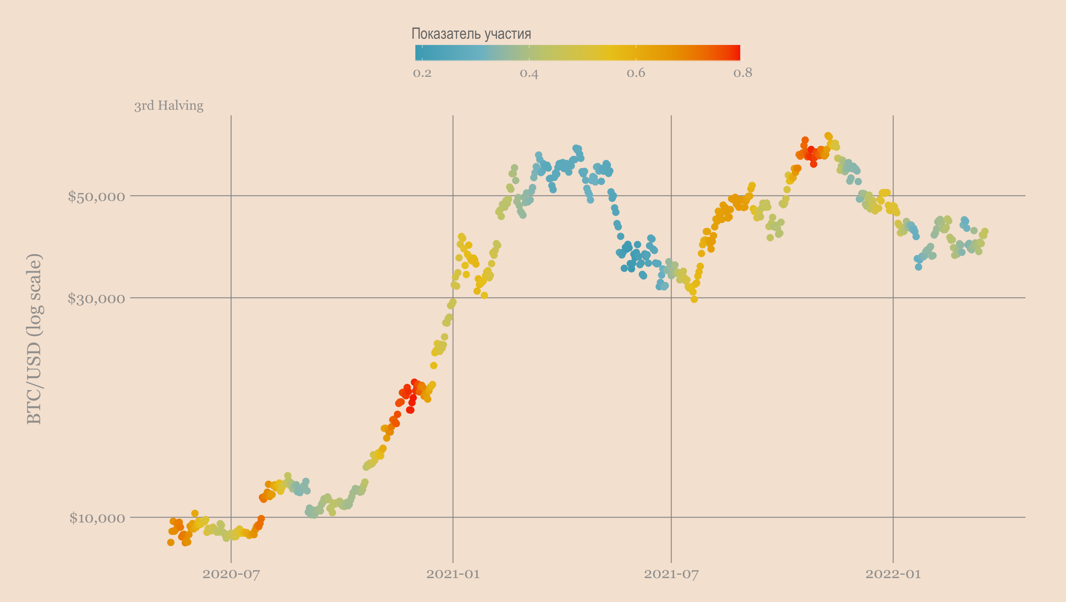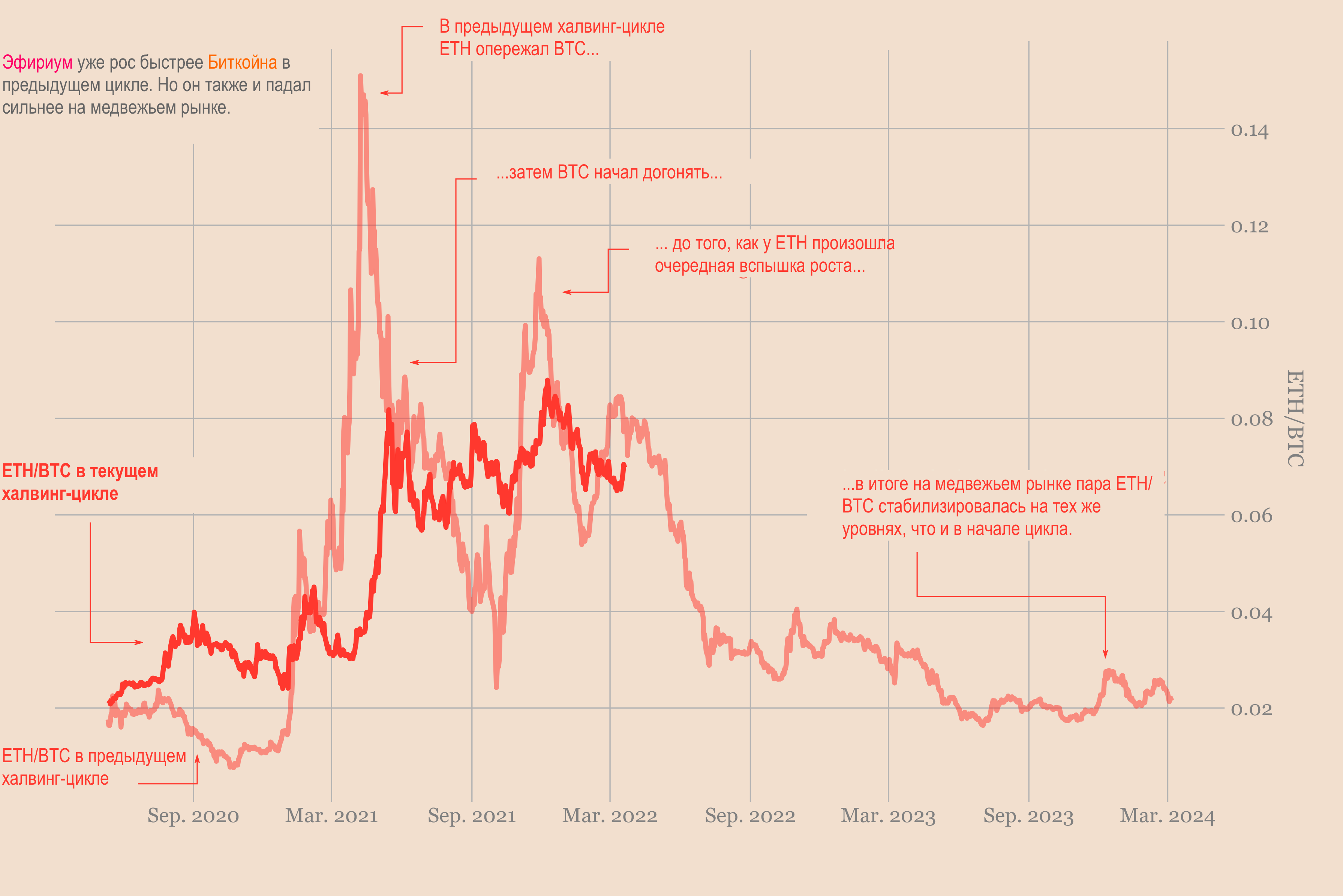 Но высокий показатель корреляции не означает, что они растут с одинаковой скоростью. И до сих пор в этом цикле ETH набирает обороты более систематически, чем во втором халвинге.