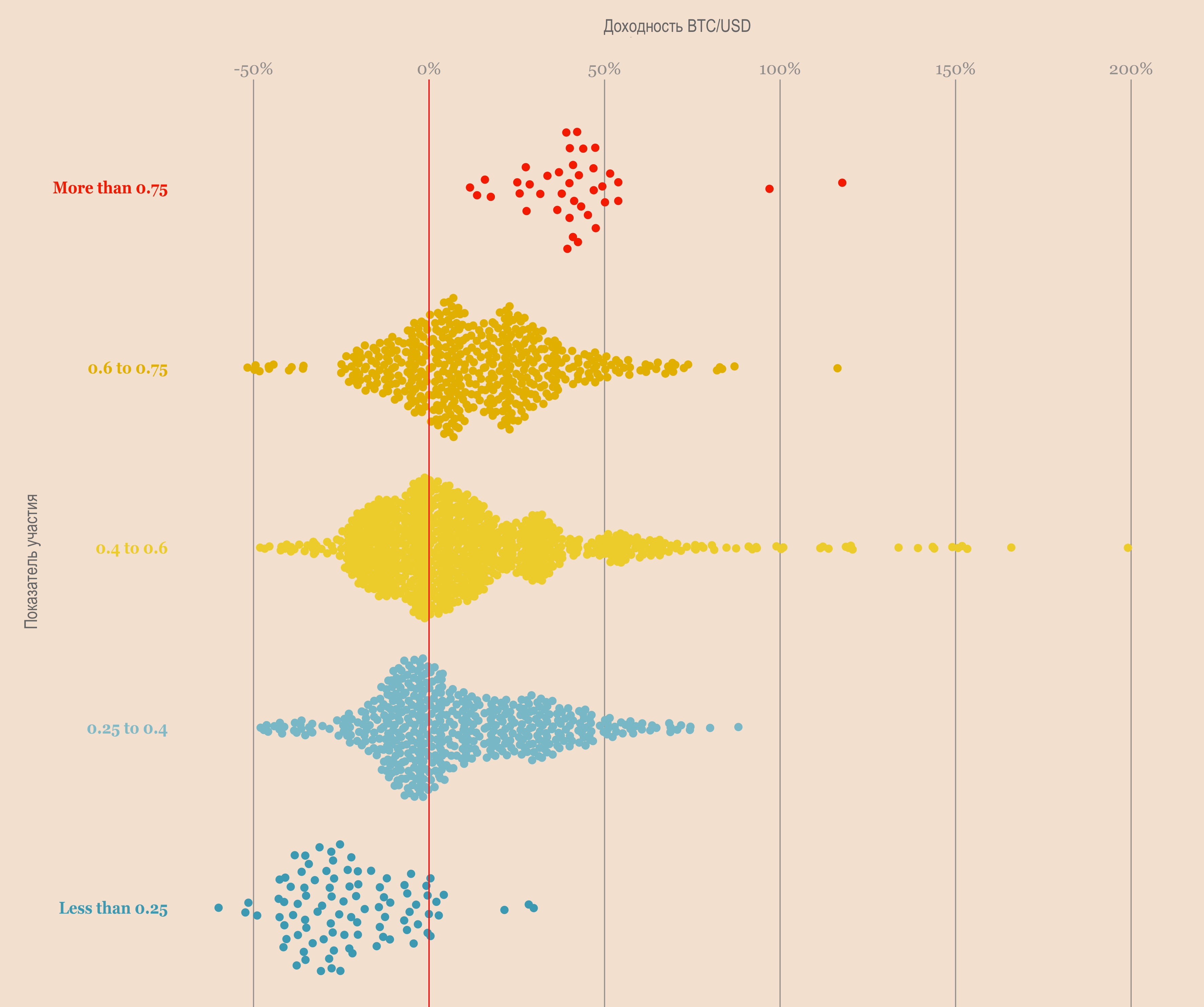 Напомним, что такая модель оценки накопления не является хорошим знаком для импульса. Если разделить показатель накопления на пять сегментов и посмотреть, как он коррелирует с доходностью биткойна за тот же период, можно заметить, что обычно вначале нужно увидеть, как значение показателя приближается к 0,6, чтобы получить шансы в свою пользу.