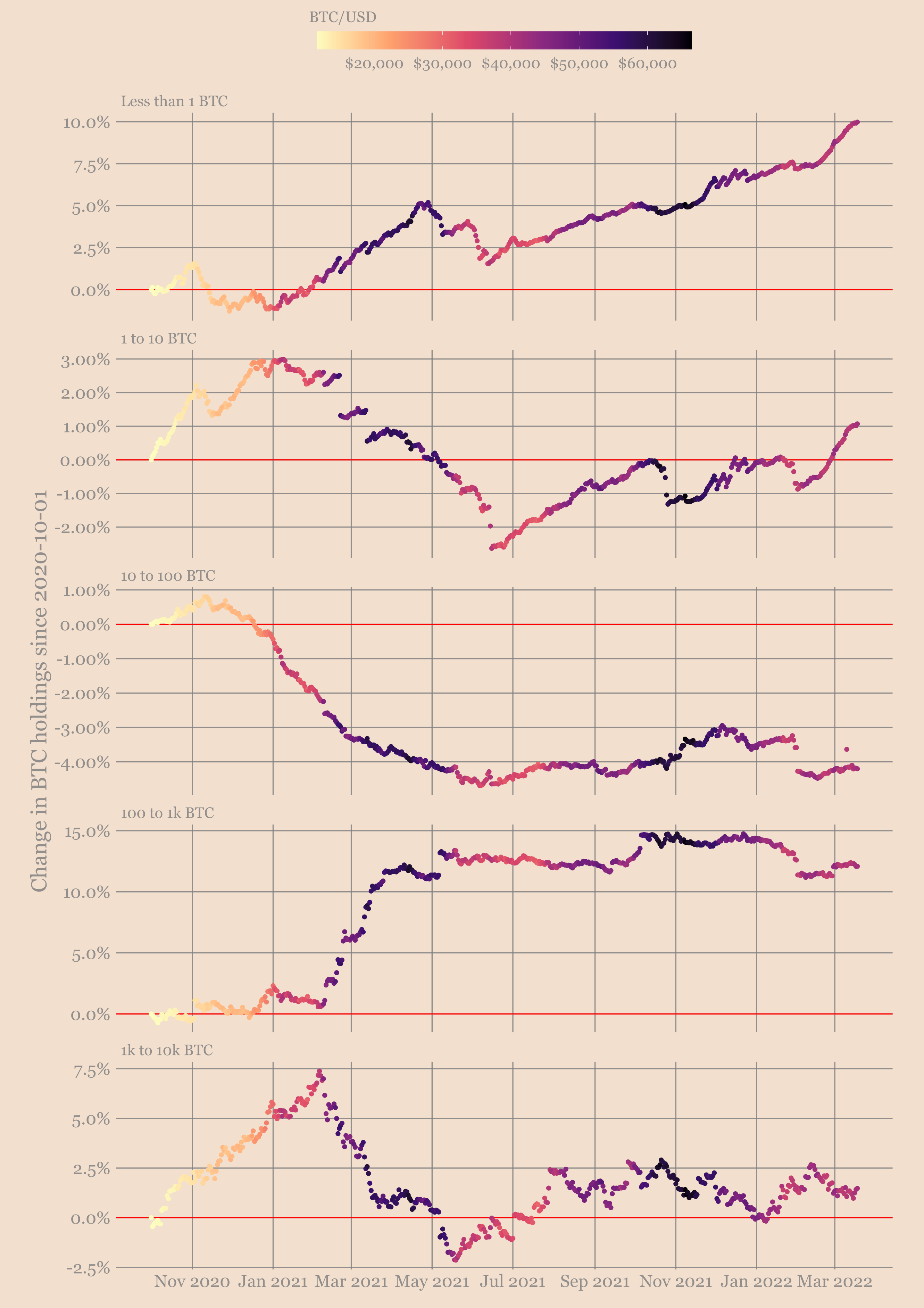 Чтобы добраться туда, нам нужно снова увидеть, как более крупные адреса накапливают монеты. Прямо сейчас увеличивается количество монет на адресах, контролирующих менее 10 BTC. Всё, что выше 10 BTC, выглядит вялым. До тех пор, пока киты не преодолеют диапазон ходлинга, установленный с августа 2021 года, я не думаю, что биткойн сможет продемонстрировать какой-либо устойчивый рост.