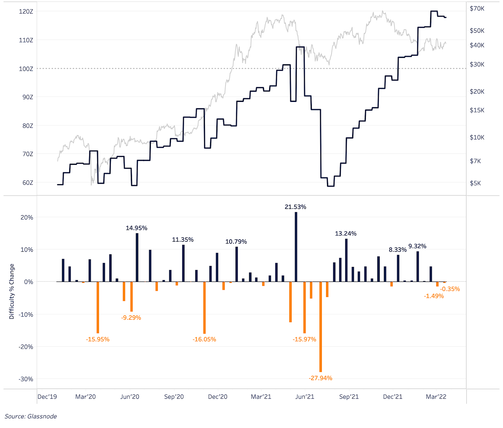 Начиная с двух последних эпох сложности, краткосрочной тенденцией было снижение хешрейта. Тем не менее, если мы находимся в тенденции увеличения хешрейта, ожидайте, что акции компаний, связанных с майнингом, и сами машины для майнинга BTC, скорее всего, будут уступать самому биткойну в периоды, когда хешрейт растёт быстрее, чем цена биткойна. Это связано с неэластичным предложением актива в условиях растущей конкуренции в глобальной гонке майнинга.