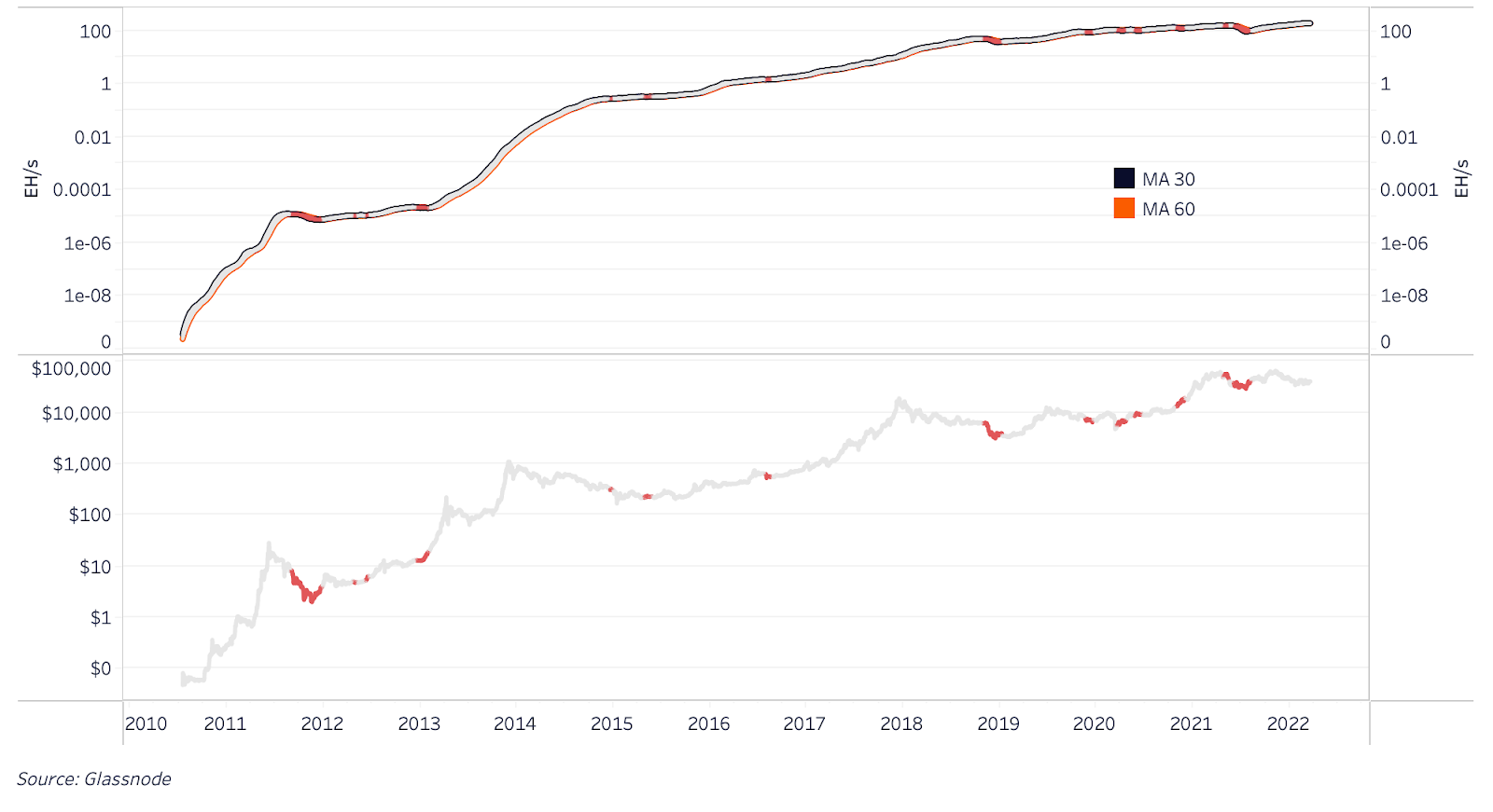 Ниже продемонстрирован исторический график того, как индикатор Hash Ribbons подавал сигнал, что исторически происходило во время медвежьих рынков, когда прибыль майнеров была значительно снижена.