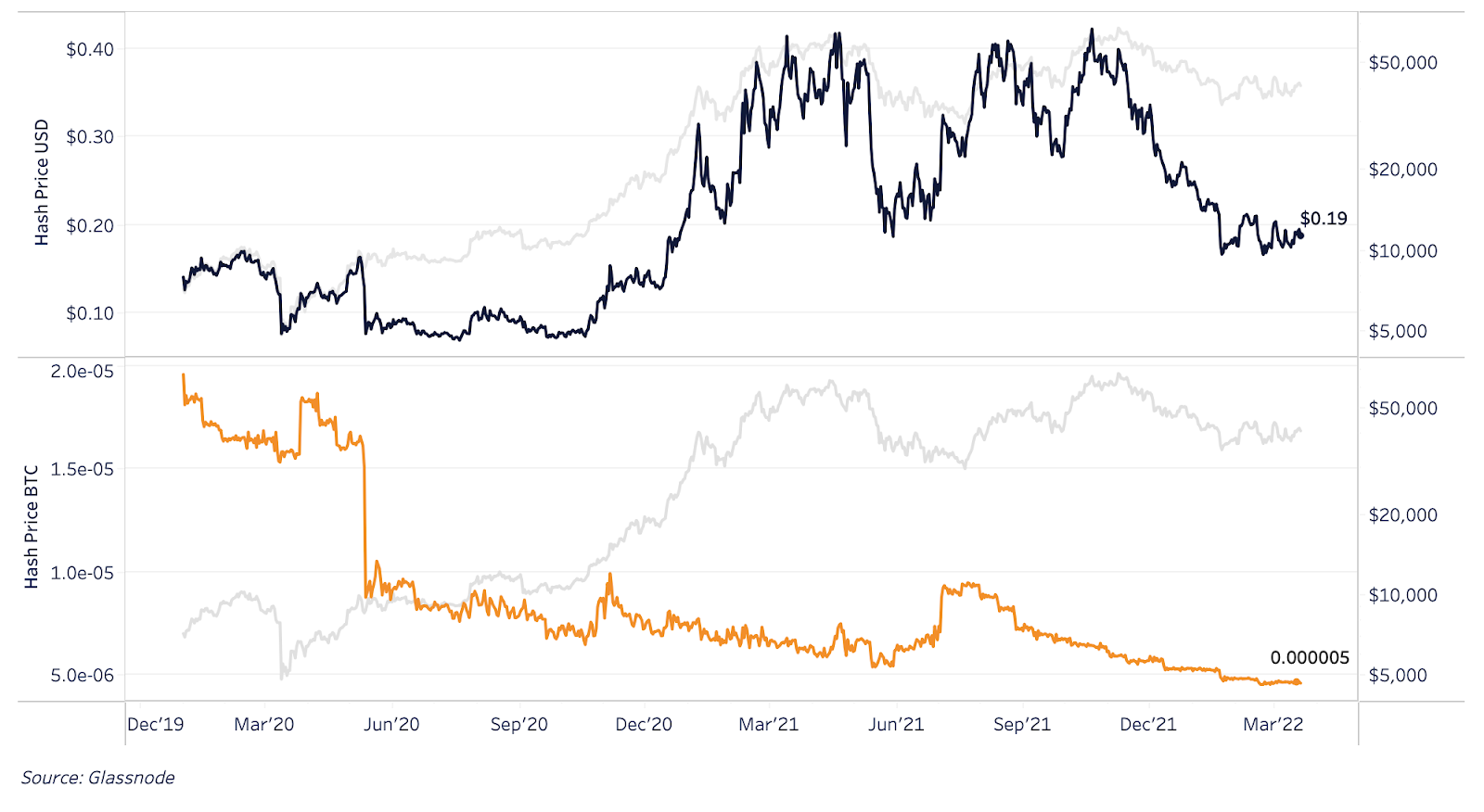 Ещё одна метрика, которую можно использовать для оценки прибыльности майнинга, — это цена хеширования биткойна, которая делит ежедневный доход майнера на хешрейт. В настоящее время цена хеширования составляет $0,19 Тхеш в день, что составляет более 50% от максимума 2021 года. При текущей цене биткойна и цене хеширования прибыльность майнеров по-прежнему находится на высоком уровне.