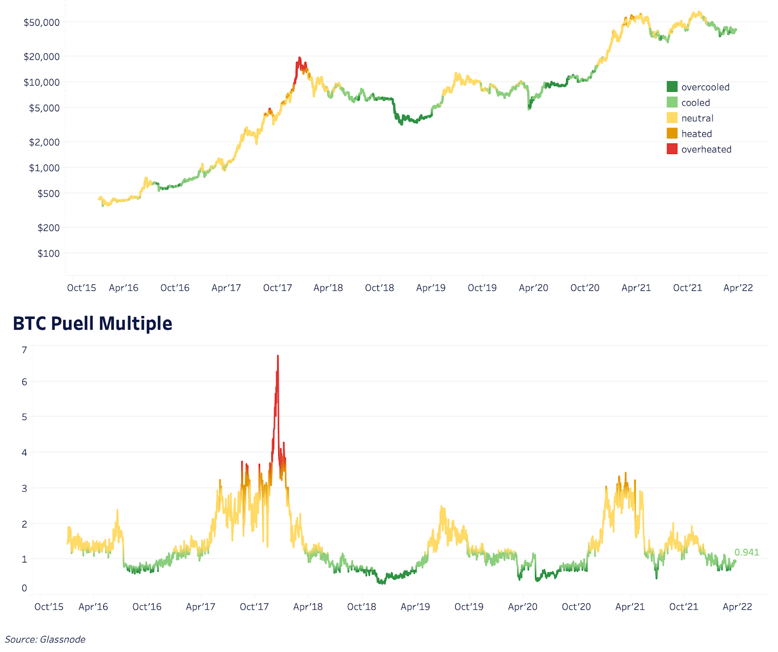 Мы также можем взять суточный доход майнеров и сравнить его с его 365-дневной скользящей средней, чтобы определить, насколько горяч или холоден рынок, в частности, в сфере майнинга, которая как правило продаёт как можно меньше BTC. Это сравнение с 365-дневной скользящей средней названо коэффициентом Пуэлла в честь ончейн-аналитика Дэвида Пуэлла.