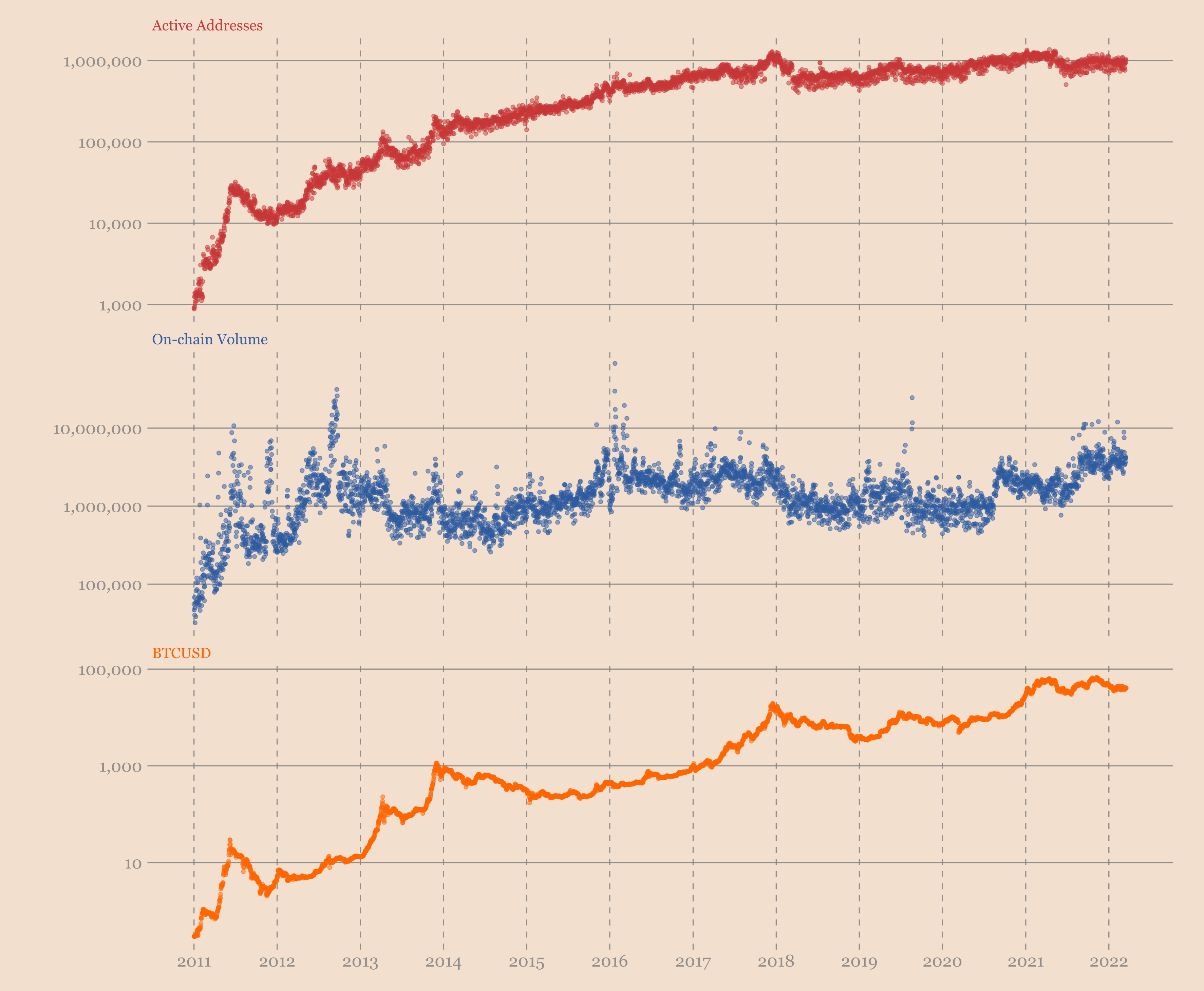 Компонентами этой модели являются количество активных адресов и объём ончейн-транзакций BTC. Результатом является цена биткойна или его рыночная капитализация, в зависимости от того, что вы хотите рассчитать.