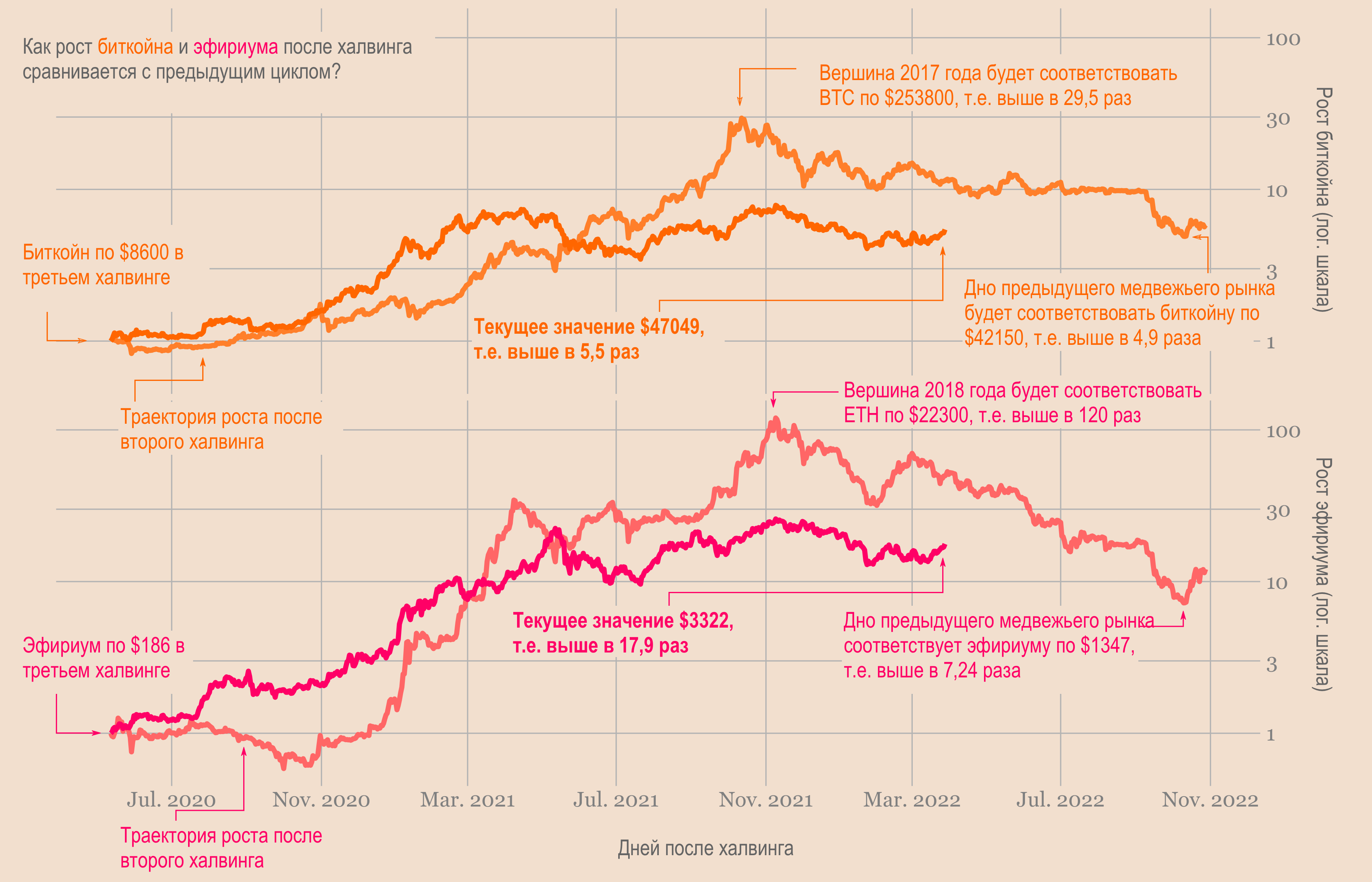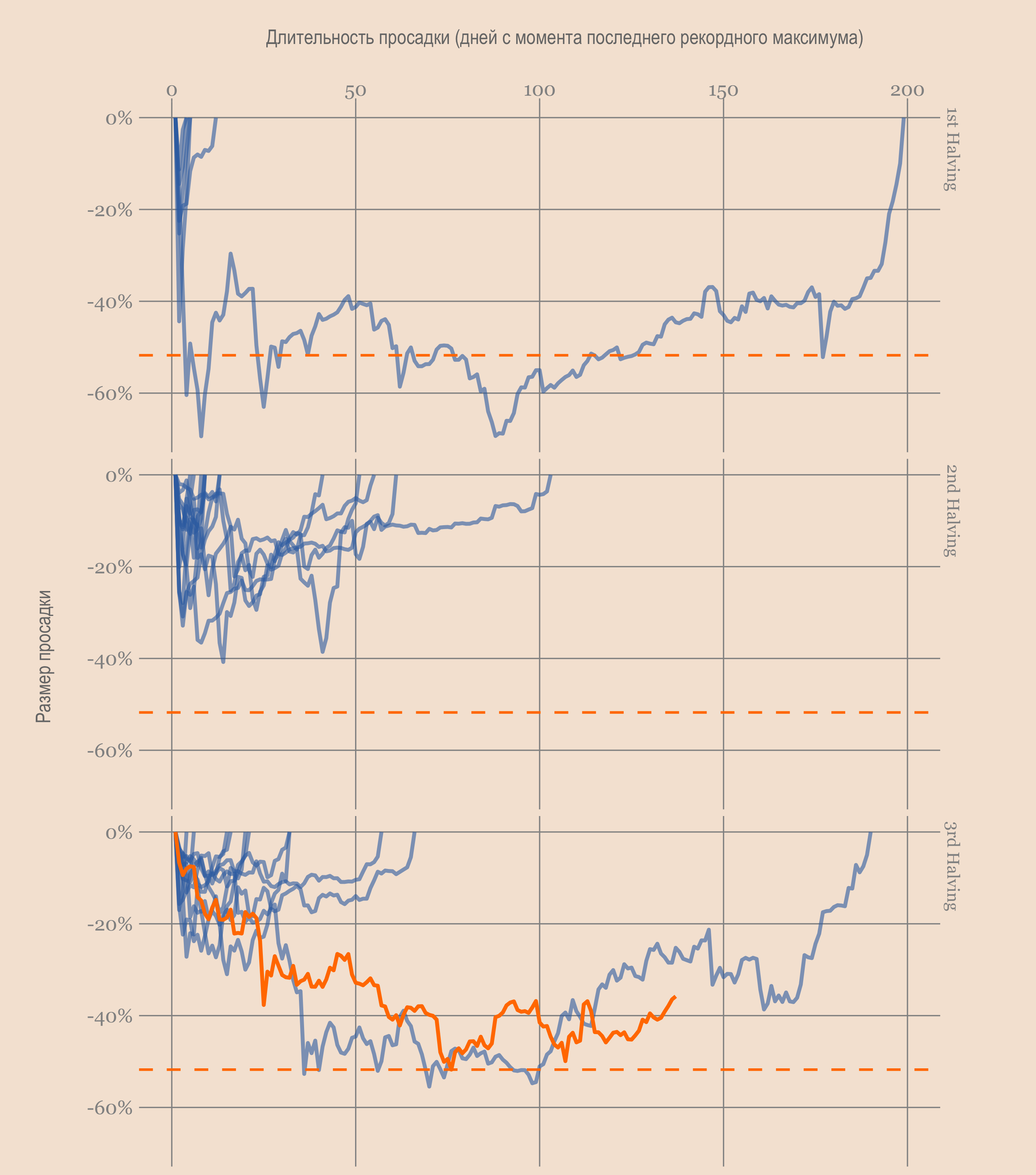 Теперь биткойн выходит со дна диапазона. Это всё ещё далеко от рекордного максимума, но если вы настроены оптимистично, то паттерн более или менее соответствует режиму восстановления из длительных просадок.