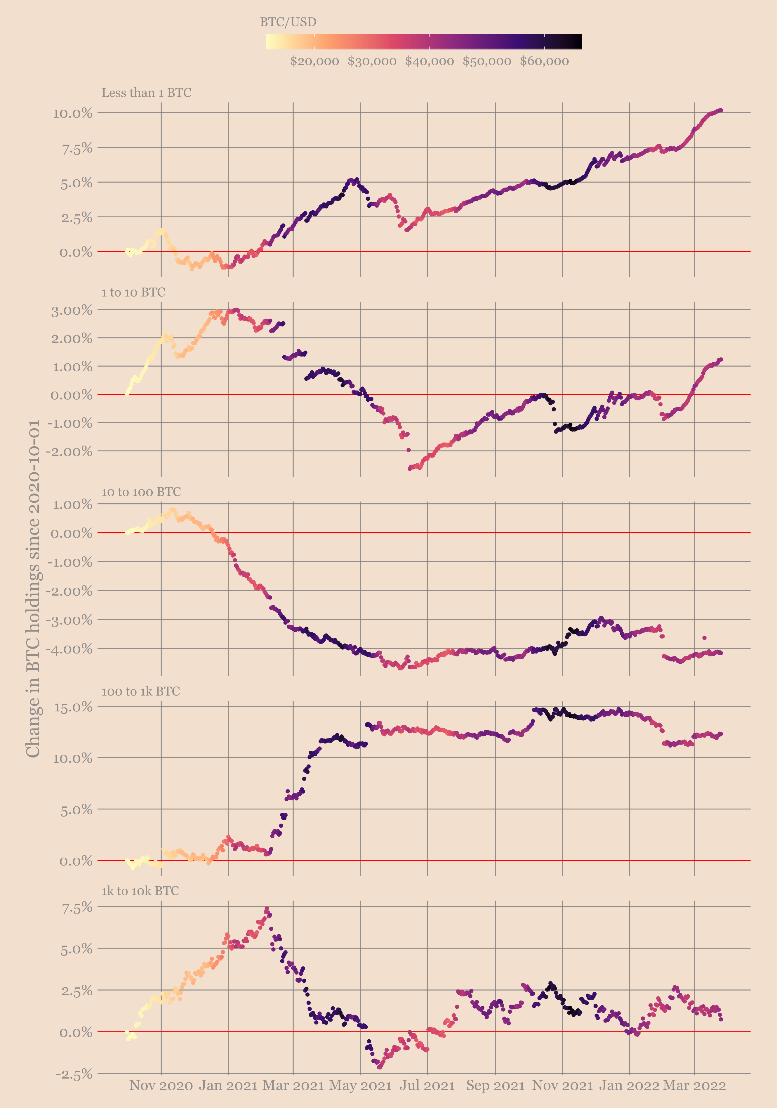 Только адресами, контролирующими менее 10 BTC. Они единственные, кто демонстрирует чёткий тренд. Адреса, контролирующие от 10 до 1 тыс. BTC, в значительной степени в боковике. А киты распределяют монеты.