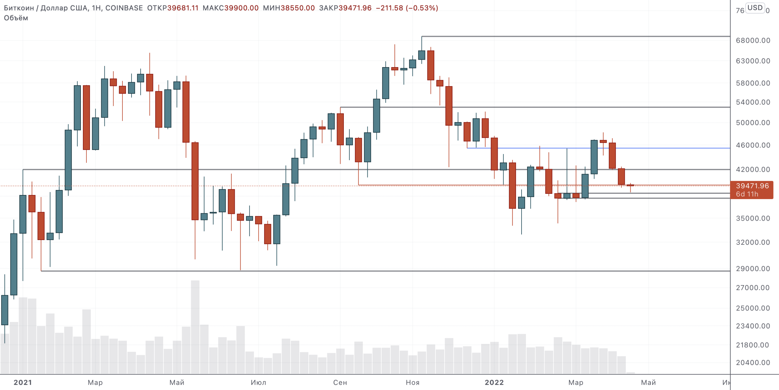 На уровень $39,2 тыс. стоит обратить внимание при закрытии сегодняшней свечи. Закрытие выше него дало бы некоторый намёк на то, что ниже этого уровня была найдена ликвидность, и теперь цена готова направиться вверх. Закрытие ниже будет означать пробой локальной поддержки.