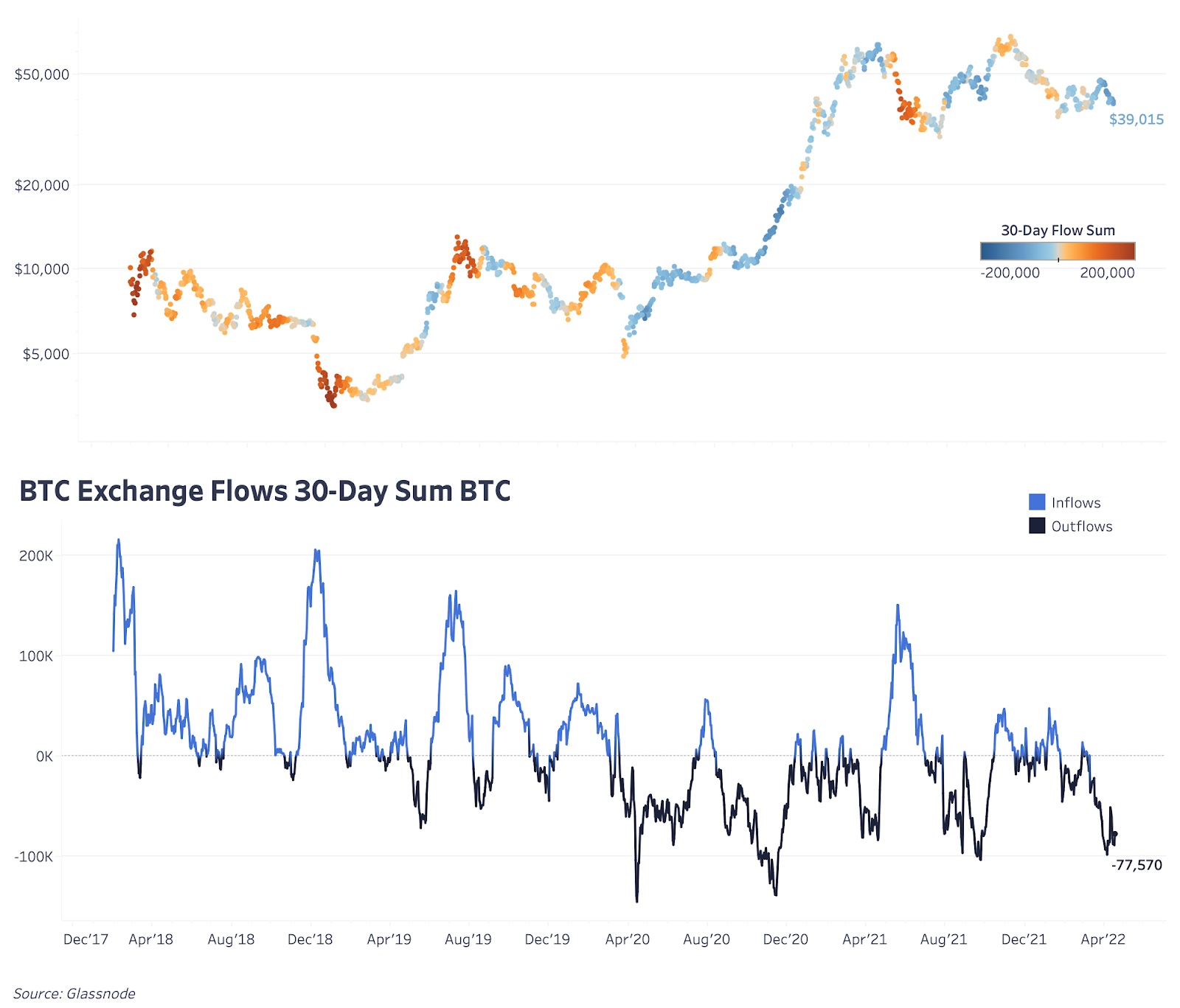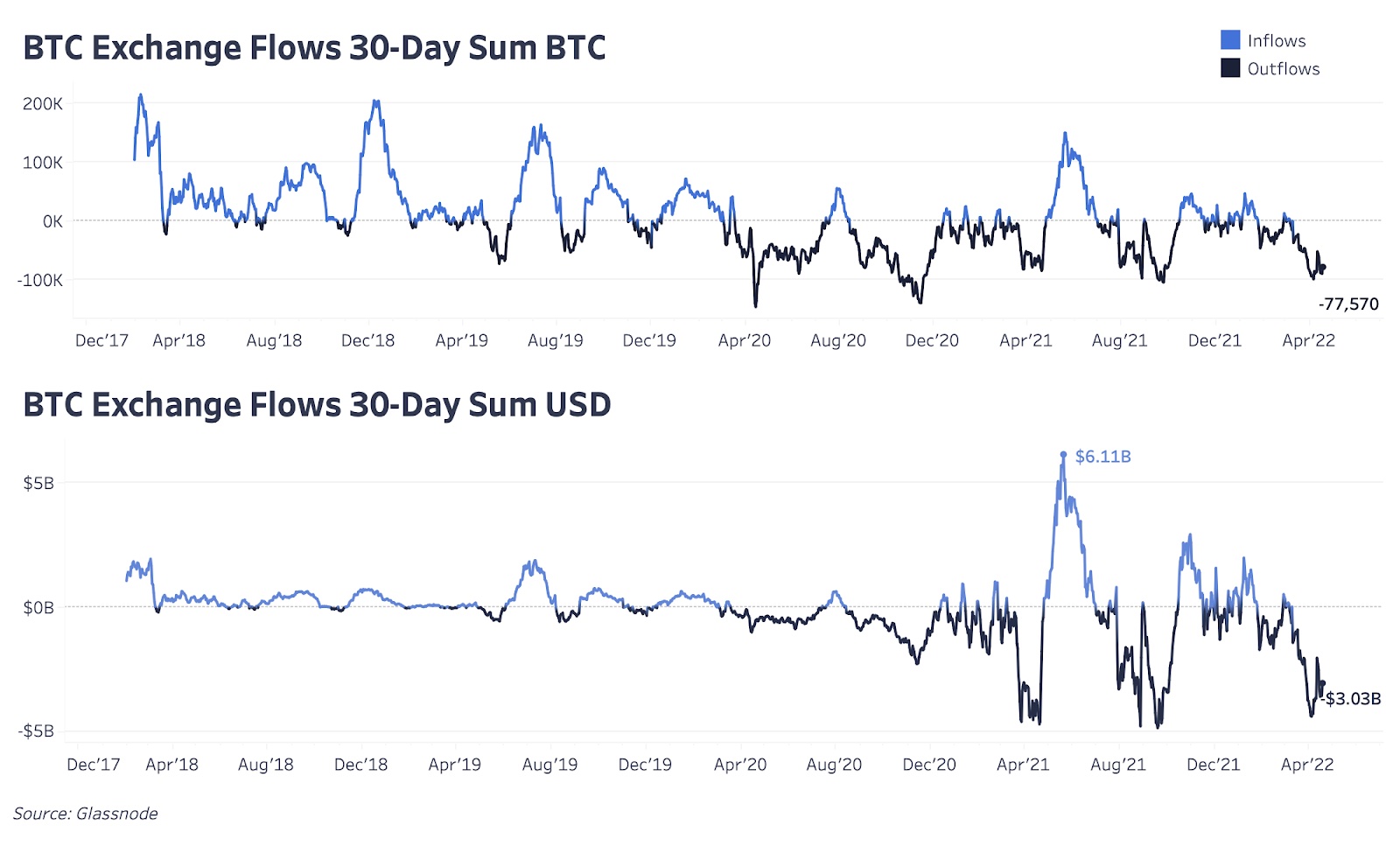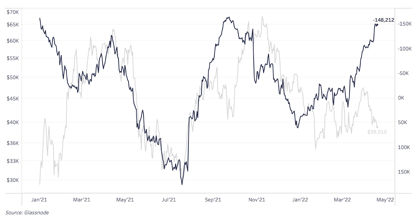 В последние месяцы наблюдается неуклонный отток BTC с бирж, несмотря на отсутствие роста цены. Объем оттока в марте 2022 стал вторым в истории и в апреле его сила пока не ослабевает. На наш взгляд, такой отток BTC с биржевых балансов является одним из лучших доступных на рынке подтверждений текущего спроса и настроений в отношении накопления.