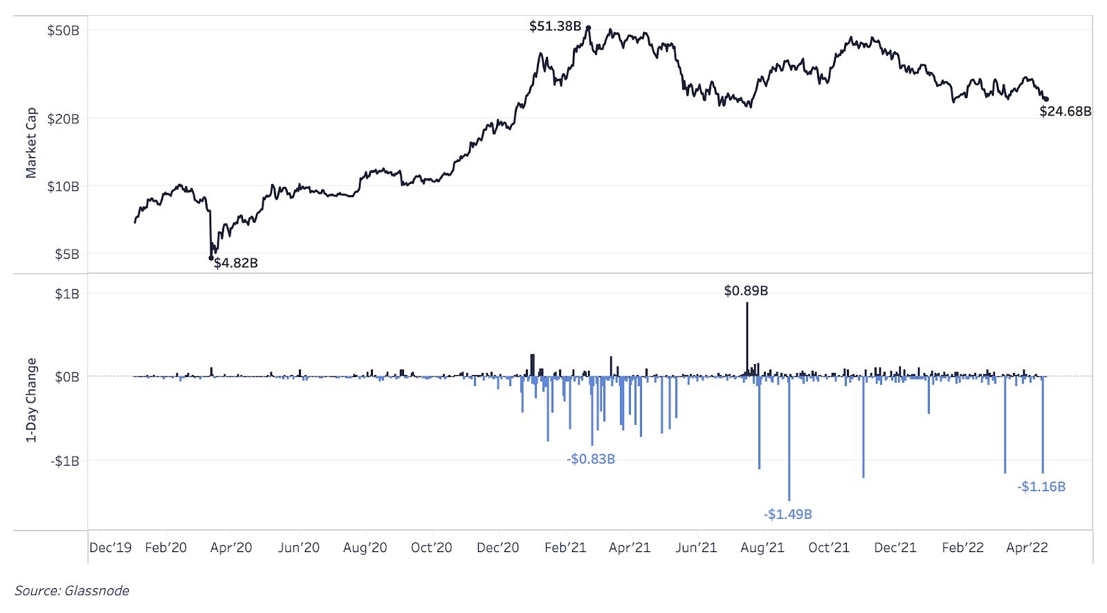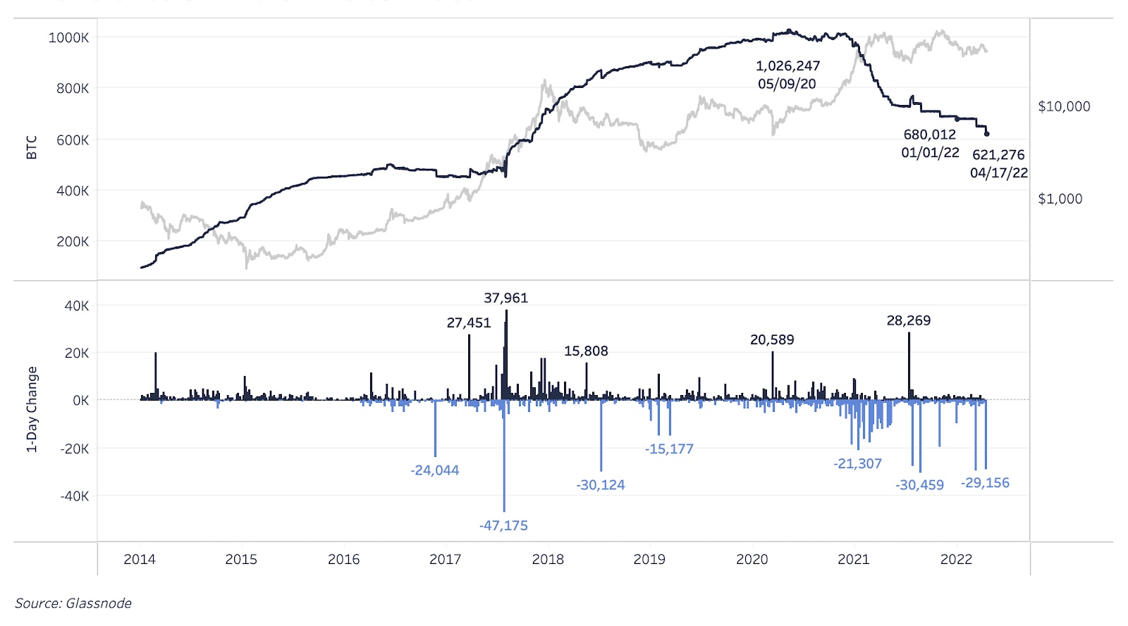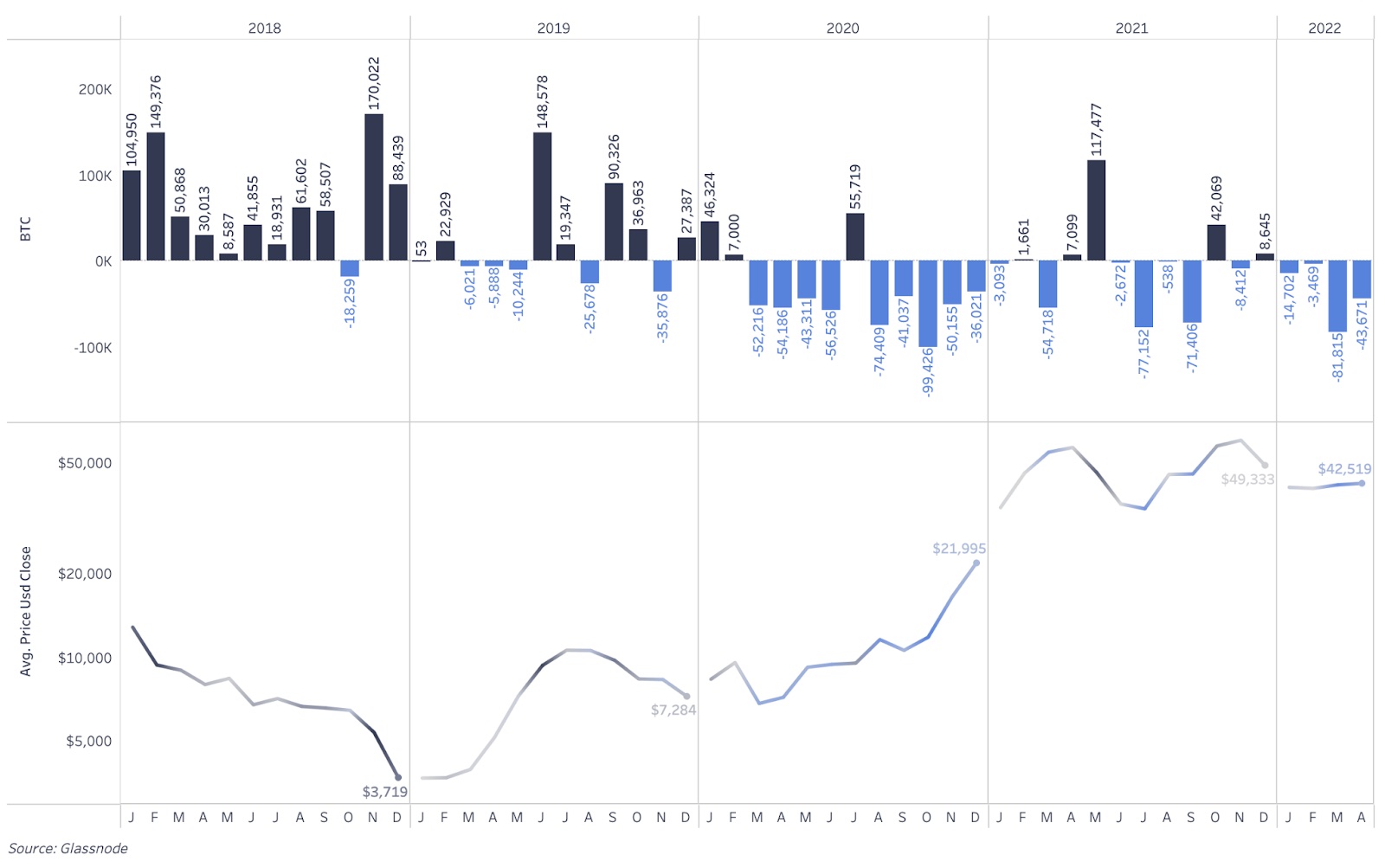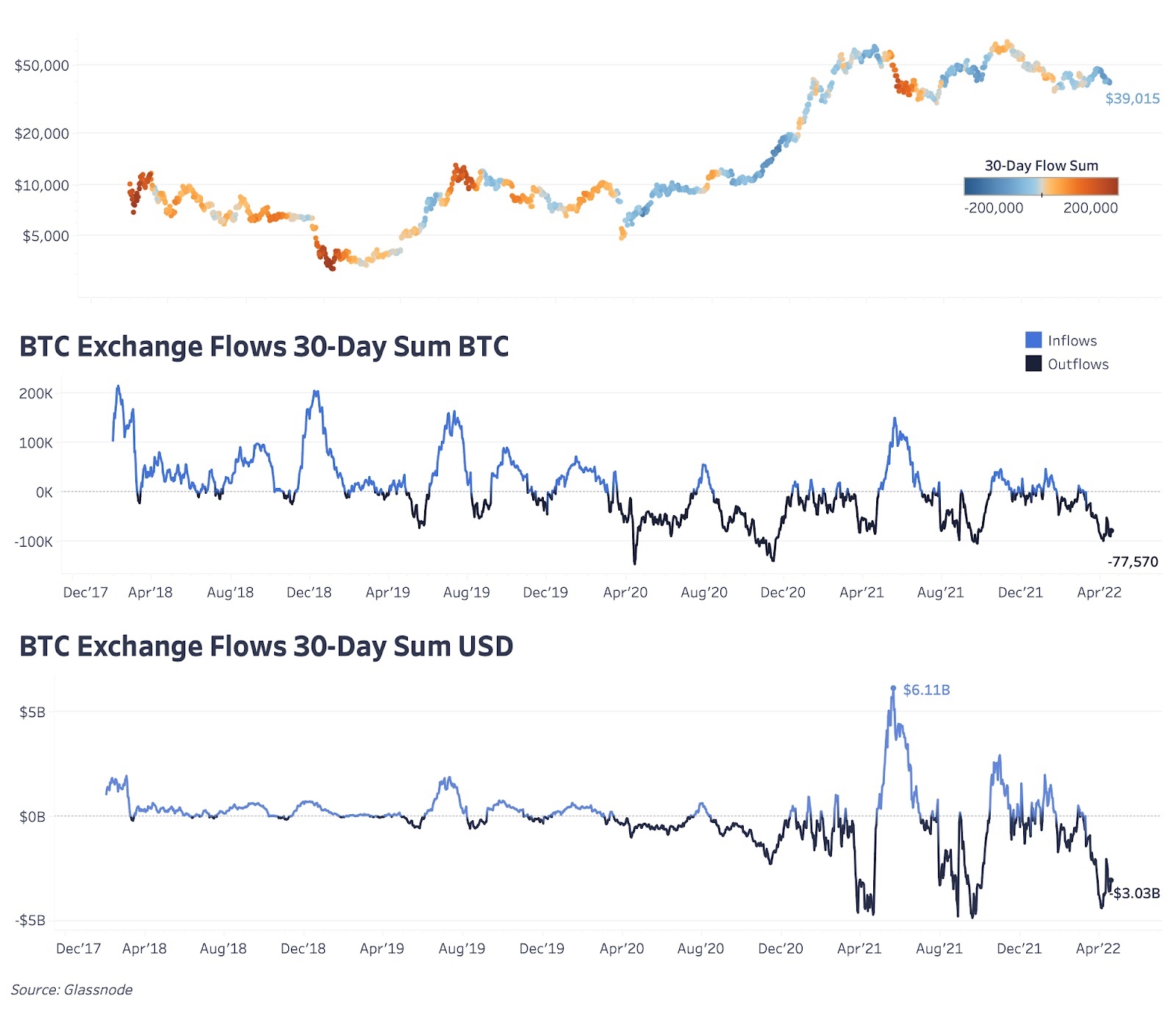 В последние месяцы наблюдается неуклонный отток BTC с бирж, несмотря на отсутствие роста цены. Объем оттока в марте 2022 стал вторым в истории и в апреле его сила пока не ослабевает. На наш взгляд, такой отток BTC с биржевых балансов является одним из лучших доступных на рынке подтверждений текущего спроса и настроений в отношении накопления.