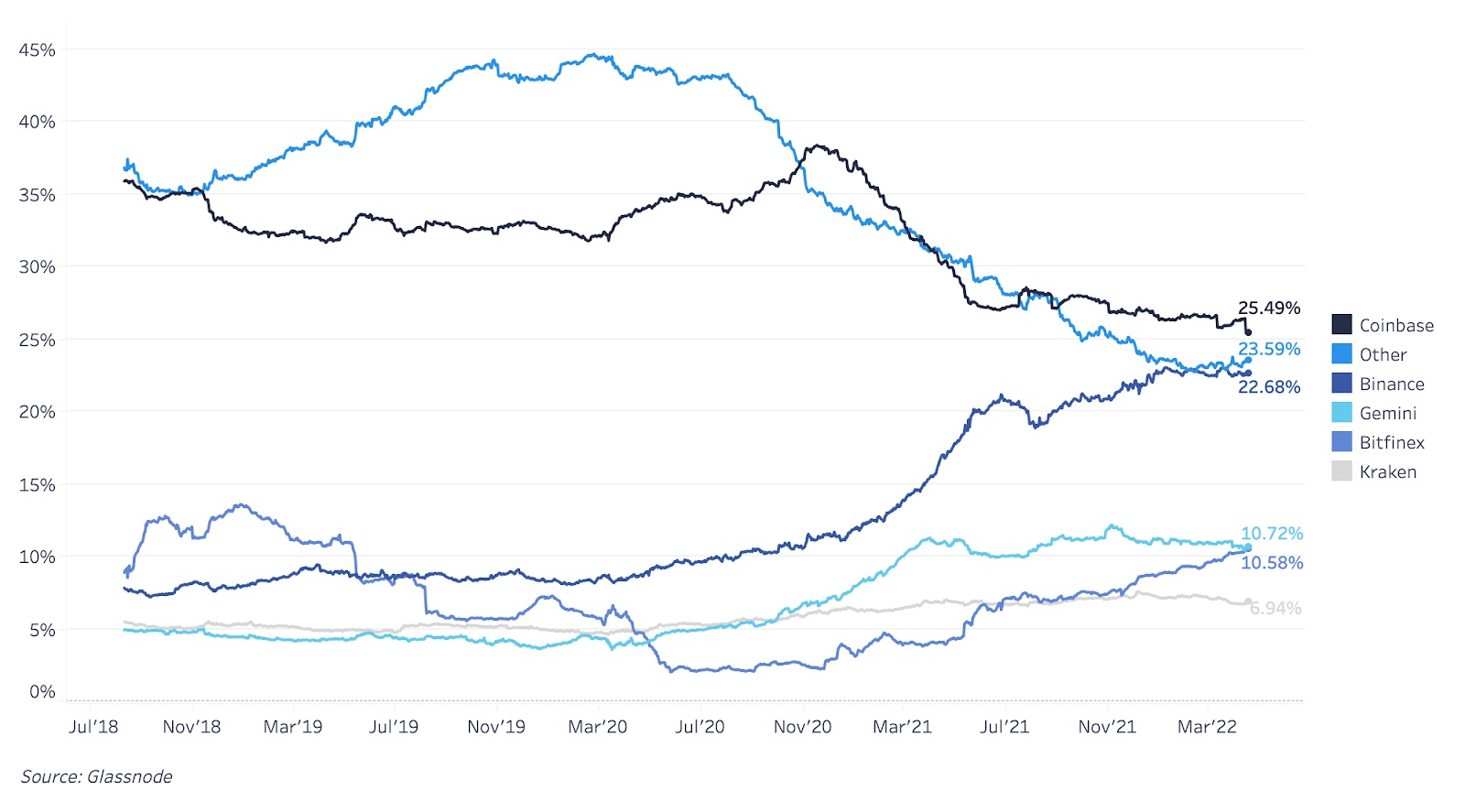 Говоря о биржевых балансах, бóльшую часть рынка можно описать через тенденции на Coinbase и Binance: на каждую из этих бирж приходится более 20% от общего объема известных биржевых балансов BTC. А вместе они составляют ~48% от общего объема известных биржевых балансов. Для определения известных биржевых адресов и балансов мы полагаемся на эвристики Glassnode и методы анализа данных.