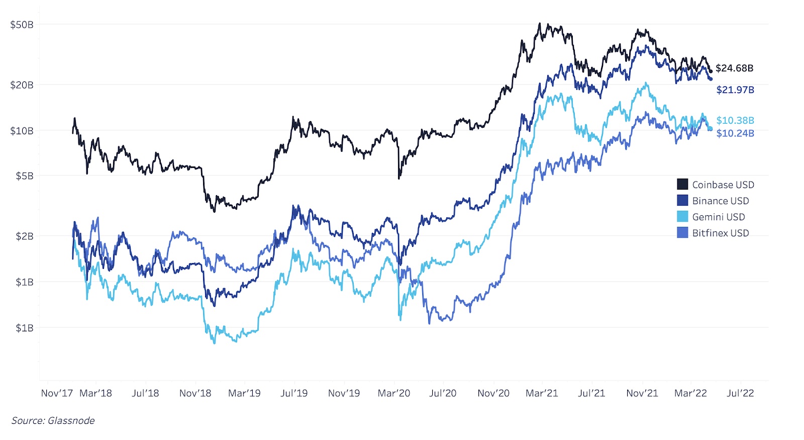 При наибольшей процентной доле в общих биржевых балансах BTC, долларовая стоимость балансов Coinbase также превосходит все остальные биржи. А в общей сложности балансы BTC на четырех ведущих биржах составляют более $65 млрд.