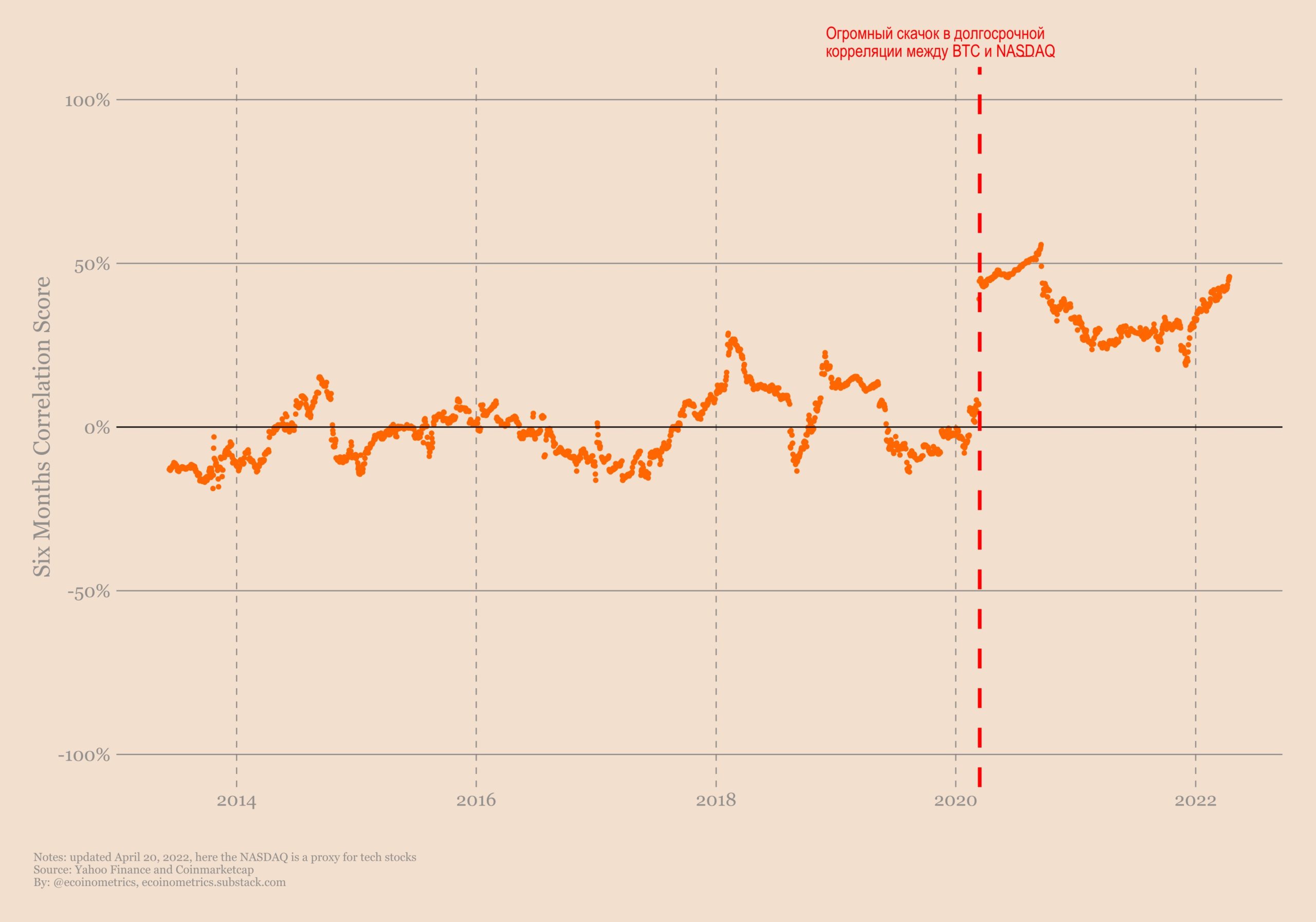 Можно было бы провести более сложный анализ взаимосвязи между курсами BTC и NASDAQ, как тот, что мы выполняли для анализа взаимосвязи между BTC и ETH. Но мне кажется, что это было бы слишком большим отступлением от общей картины.