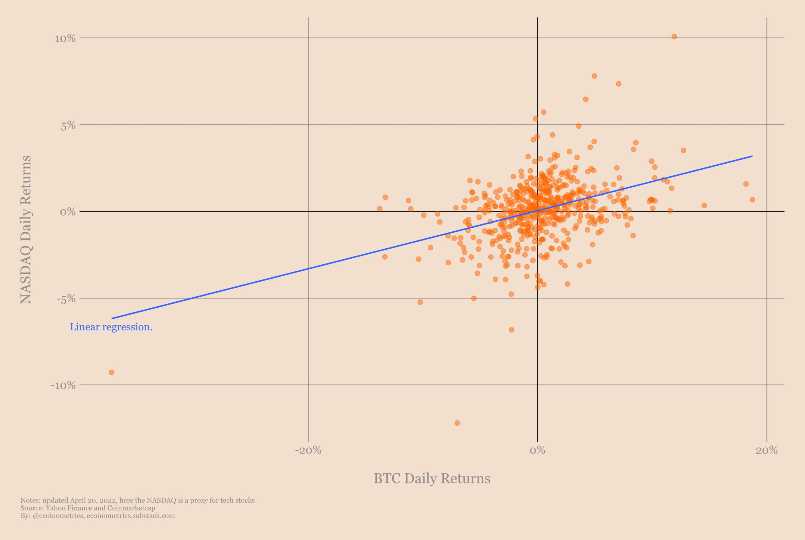 Если кому-то интересно, что будет, если исключить из расчета эффект выходных (NASDAQ ведь не торгуется 24/7, как биткойн), то картина будет той же. Ничего нового.
