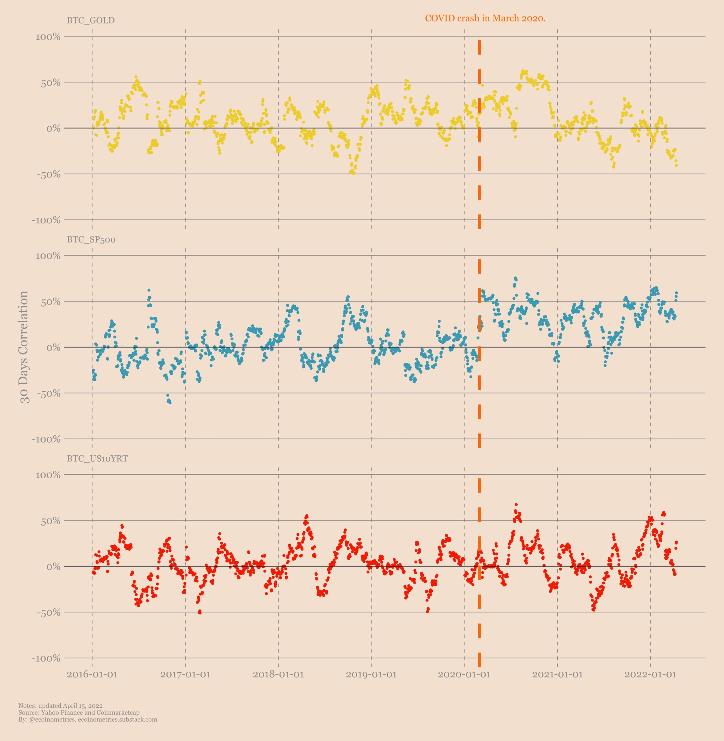 Если уменьшить масштаб и взглянуть на 6-месячную скользящую корреляцию, то смена режима будет еще более очевидной. Существует четкое разделение на до и после «пандемийного» обвала.