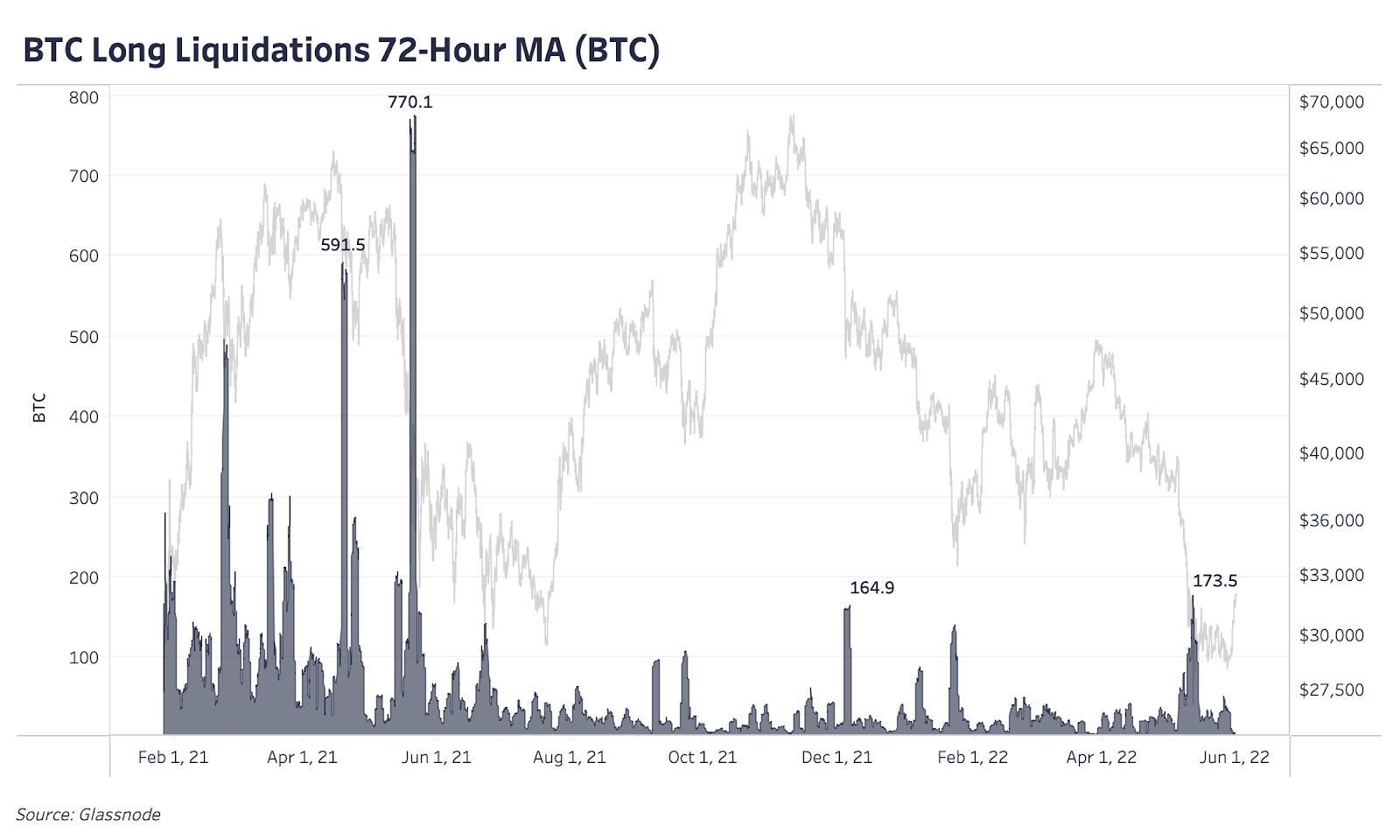 Одна из лучших стратегий на любом рынке, и особенно на таком молодом, как рынок биткойна, состоит в том, чтобы заходить по-крупному, когда другие становятся вынужденными продавцами. Это часто происходит в форме ликвидаций на рынке деривативов, причем впечатляющие эпизоды ликвидаций случаются один или два раза в год. И хотя это конкретное падение не было обычным ликвидационным событием на рынке деривативов, имела место принудительная ликвидация многомиллиардных запасов Luna Foundation Guard вкупе с давлением продаж со стороны других криптофондов.