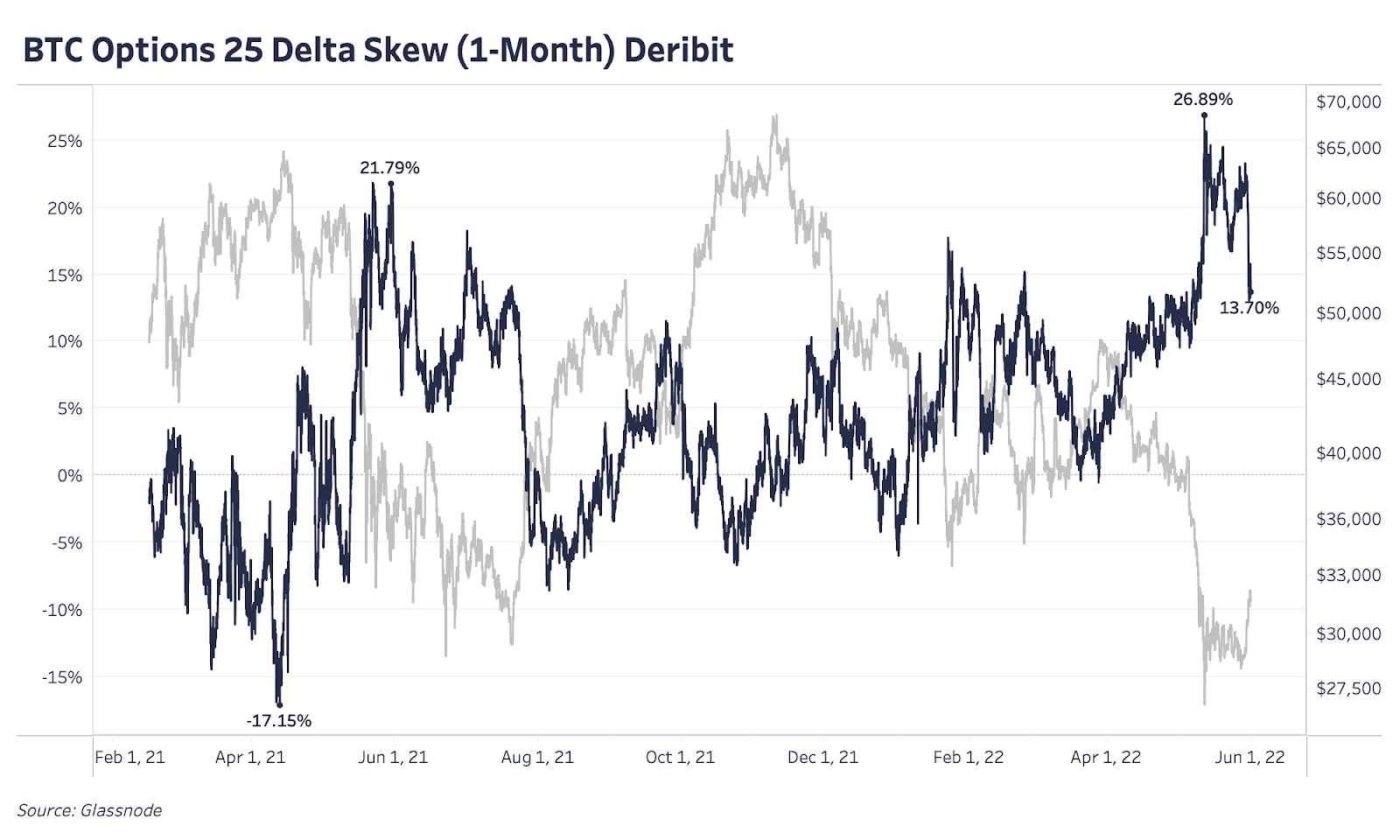 Наконец, хотя рынок опционов производит несколько более эзотеричное впечатление, на нем тоже можно наблюдать перекос в 25% дельте, которая, говоря простым языком, измеряет относительную премию, причитающуюся пут- и колл-контрактам. Когда показатель положительный, это говорит о том, что трейдеры готовы платить больше за хедж против снижения курса BTC в форме пут-опционов; когда дельта отрицательная, это значит, что коллы стоят дороже путов (более высокая ожидаемая волатильность).
