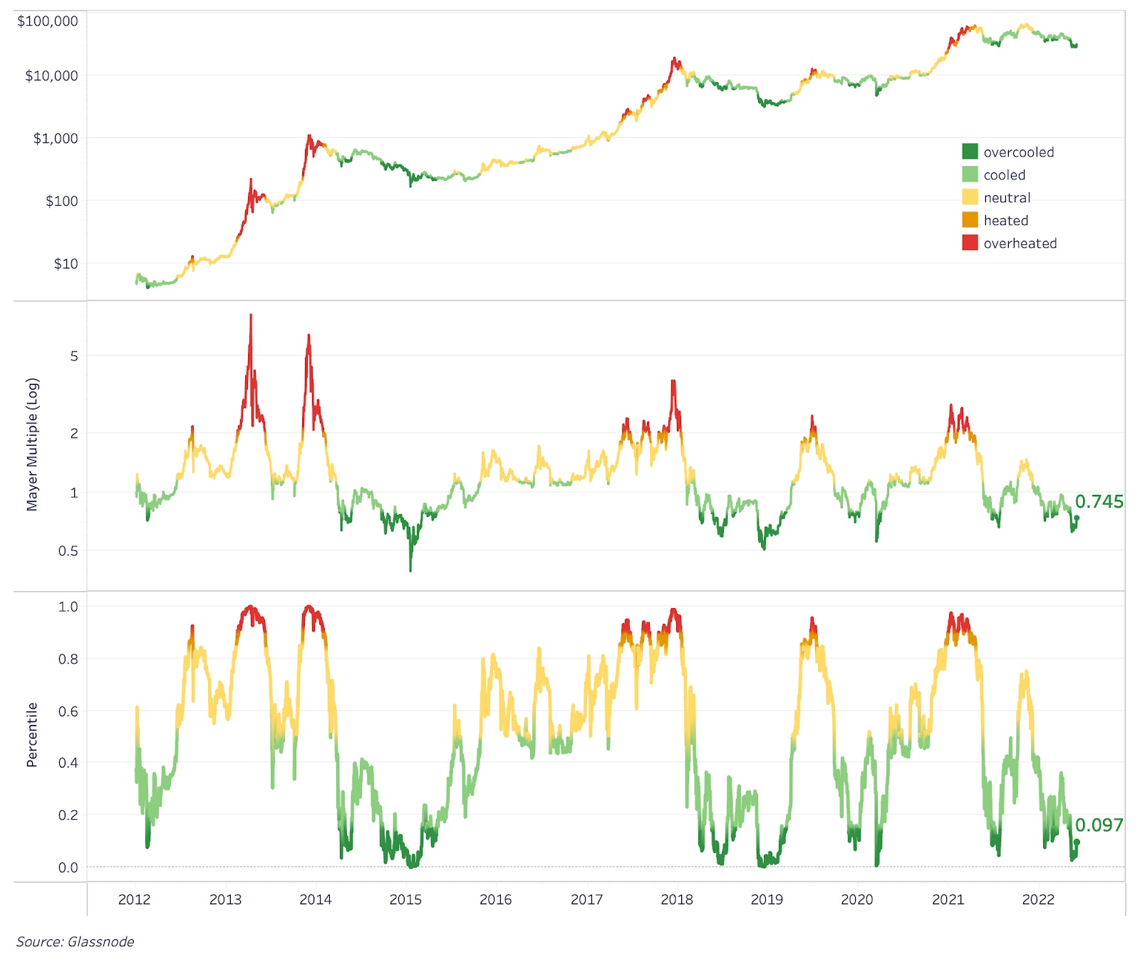 Коэффициент Майера, придуманный Трейсом Майером, просто отслеживает величину отклонения цены BTC от своего 200-дневного скользящего среднего. Исторически любые значения коэффициента ниже 0,8 указывали на прекрасную возможность для покупки. Текущие значения этого индикатора находится в девятом процентиле исторических значений.