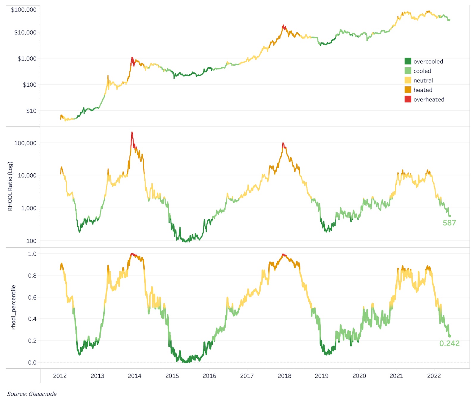 Метрика под названием RHODL Ratio представляет собой соотношение между реализованной капитализацией Биткойна для краткосрочных (1 нед.) и долгосрочных (1–2 года) владельцев. Простыми словами, используя прозрачность блокчейна, метрика оценивает относительный уровень неустойчивости и «перегрева» рынка биткойна.