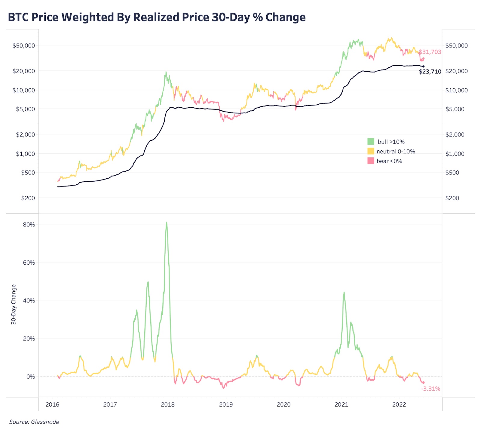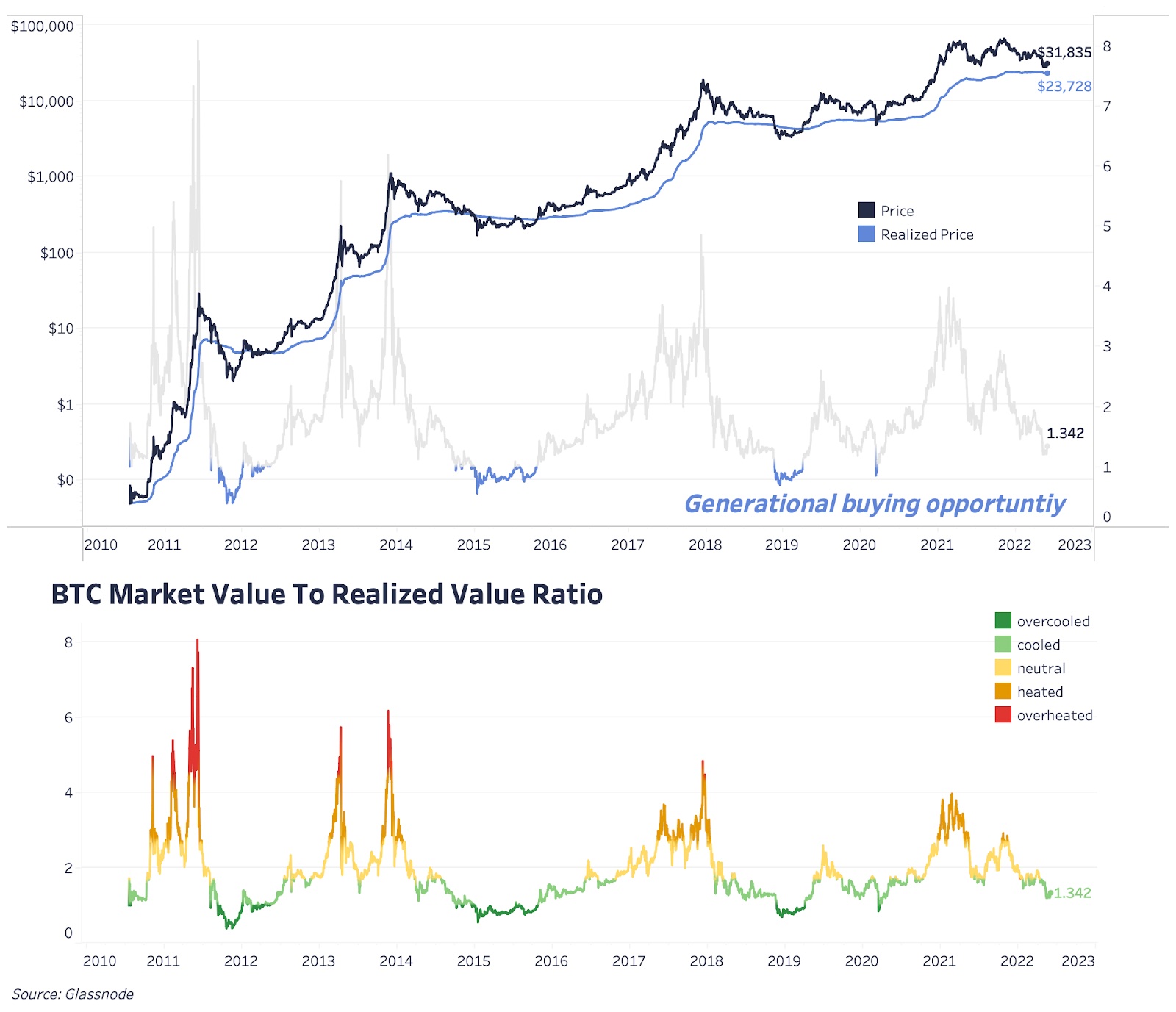 Еще один прекрасный способ визуализировать рыночный цикл биткойна представляет отношение рыночной стоимости BTC к реализованной (Market Value To Realized Value Ratio, или MVRV), один из наших излюбленных индикаторов. В конце 2021 года мы рассматривали уровень реализованной цены в $25 тыс. (сейчас она составляет $23,7 тыс. из-за продаж в убыток) как великолепную точку входа в случае общего снижения на глобальных рынках. Возврат к уровню реализованной цены происходит практически в каждом медвежьем рынке, и хотя гарантировать повторения паттерна нельзя, размещение лимитных ордеров на этих уровнях, в нашем понимании, является разумной стратегией для части вашего свободного капитала.