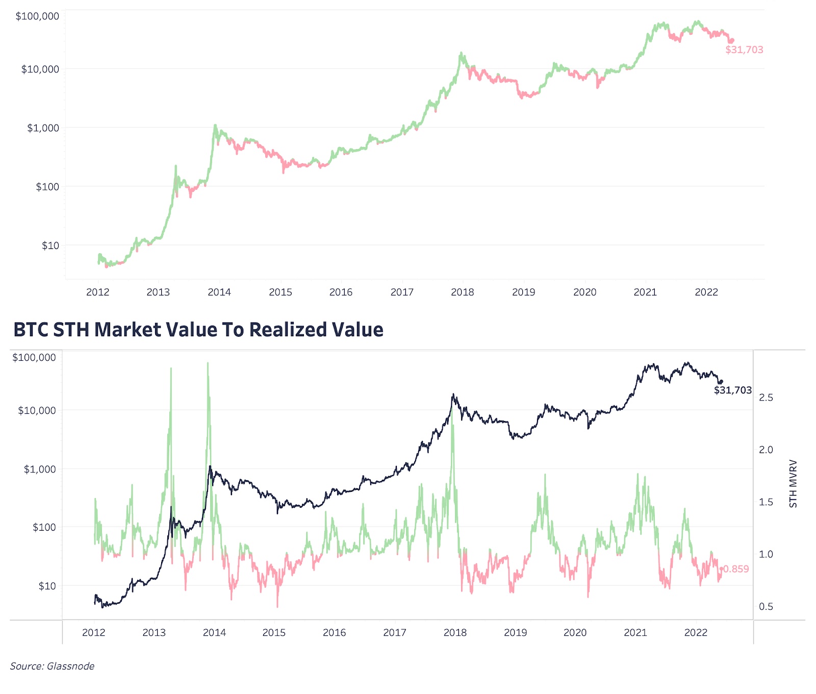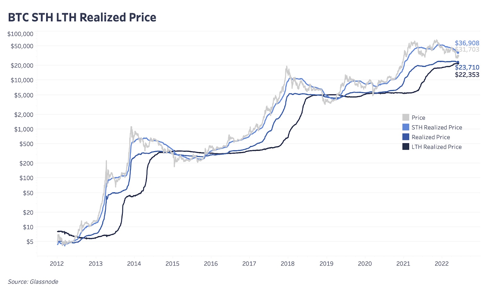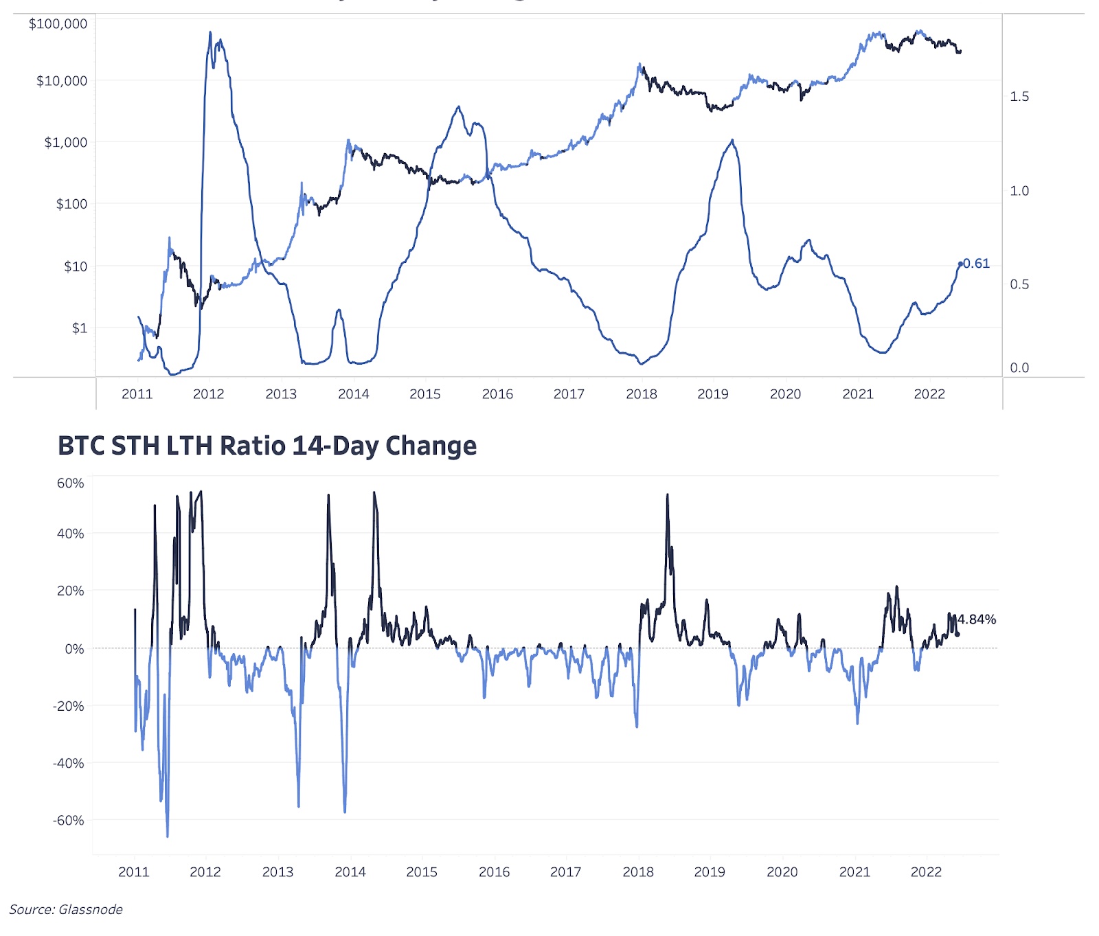 Мы также обращаем внимание на соотношение долгосрочных и краткосрочных держателей и на их уровни реализованной цены. На основе относительного изменения базисов себестоимости для долгосрочных и краткосрочных инвесторов можно получить некоторое представление о поведении инвесторов.