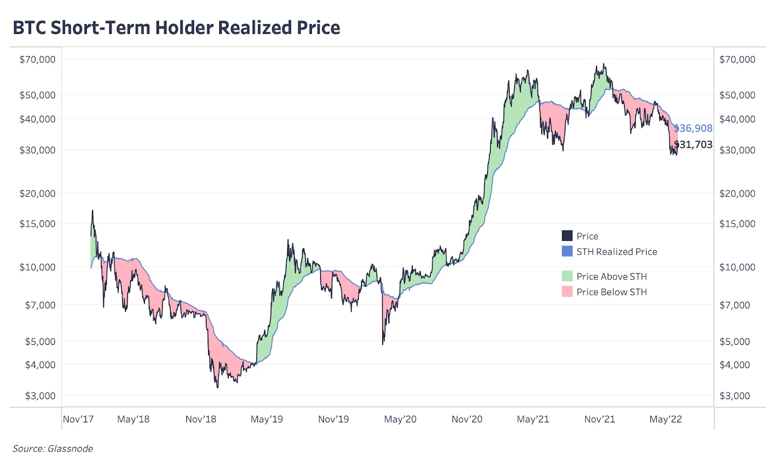 Базис себестоимости для краткосрочных держателей показывает, находятся ли новые инвесторы в среднем в прибыли или терпят убытки по своим недавним инвестициям в BTC. Определяющий момент для бычьих/медвежьих рынков биткойна состоит в том, торгуется ли цена выше или ниже среднего базиса себестоимости для краткосрочных держателей. Если выше, то новый капитал, конкурируя за доступ к активу, толкает цену вверх. Если ниже, то убыточные позиции при приближении к базису себестоимости капитулируют и распределяются на рынке. Подробное описание этой динамики мы приводили в этом посте: Анализ краткосрочного держателя.