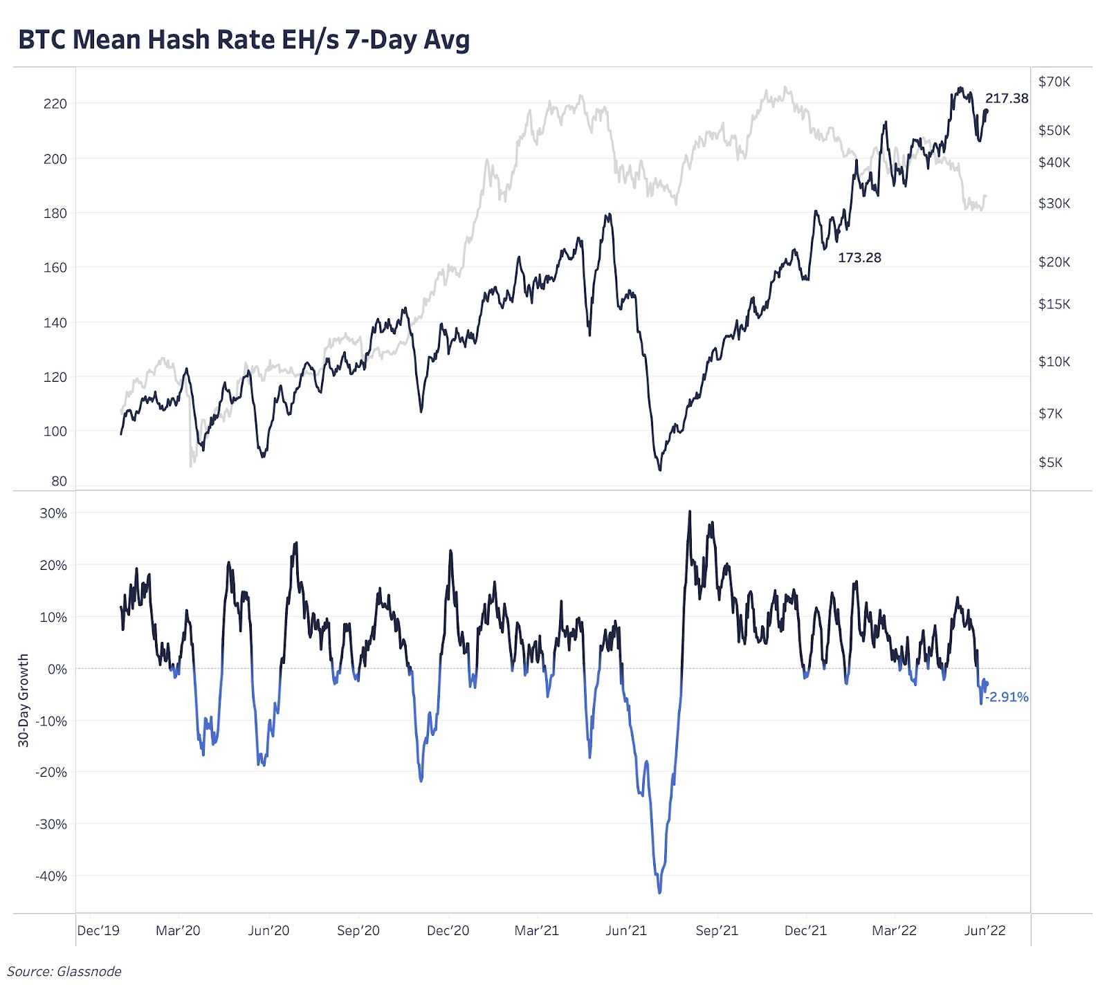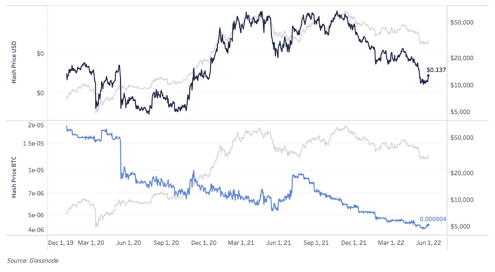 Снижение цены хеша вслед за падением цены BTC и корректировкой сложности в сторону повышения продолжает свое свободное падение с более чем $0,42 на пике 2021 года до $0,137. Майнеры получили некоторое облегчение с последней корректировкой сложности на 4,33% в сторону понижения — самым большим снижением за последний год.