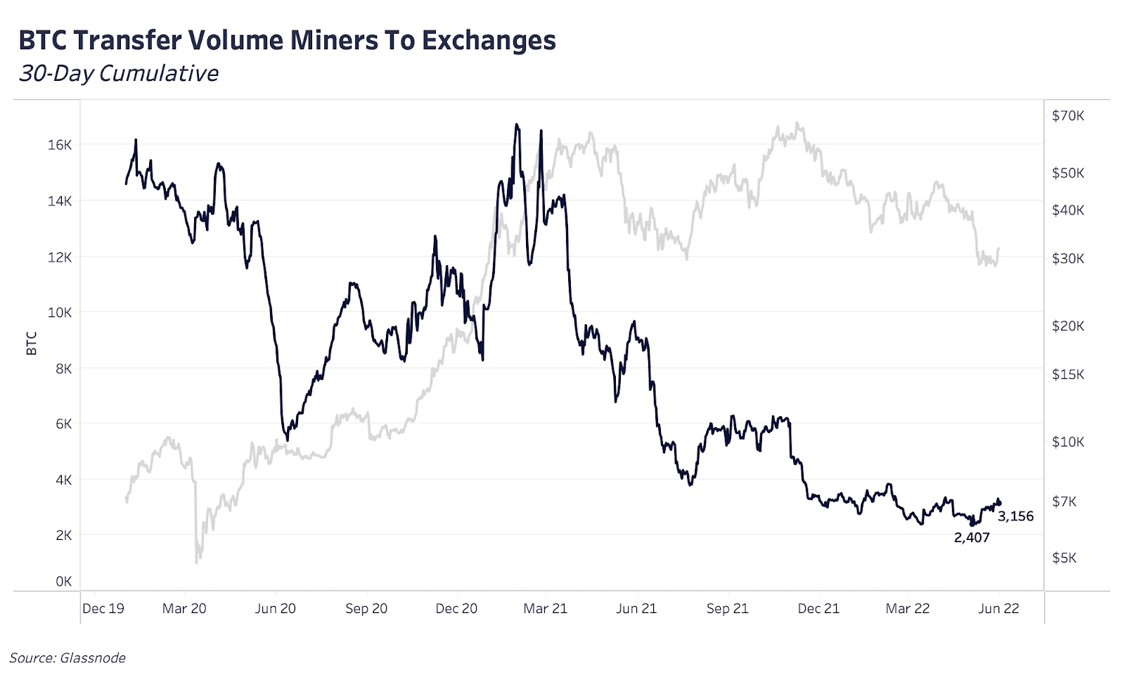Опираясь на расчетные данные Glassnode о количестве биткойнов, отправленных майнерами на биржи, в качестве замещающей переменной для общего давления продаж со стороны майнеров, можно наблюдать небольшое увеличение объема такого трансфера на 30-дневной кумулятивной основе. Как один из примеров, Cathedra Bitcoin за прошедший месяц продала большую часть своих биткойн-активов, объяснив это подготовкой к продолжительному рыночному спаду, привлечением и сохранением наличных средств, а также сокращением рисков.