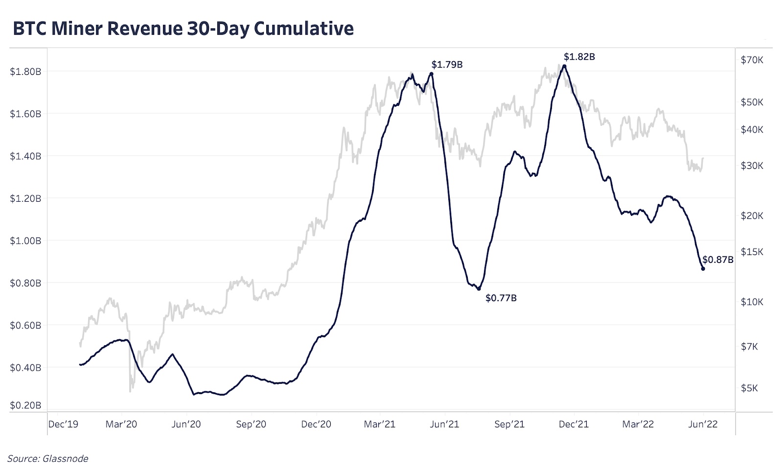 Наконец, коэффициент Пуэлла, отслеживающий доход майнеров в долларах США относительно скользящего среднего значения за 365 дней, показывает, что текущий доход майнеров находится на уровне 72% от среднегодового показателя. То есть доход, получаемый майнерами сегодня, существенно ниже того, что они получали в последние 365 дней. Продолжительные периоды такого снижения доходности майнинга на медвежьих рынках приводили и, вероятно, еще приведут к усилению капитуляции майнеров. За последние 30 дней общий совокупный доход майнеров составил менее $1 млрд и стремится к минимумам июня 2021 года.