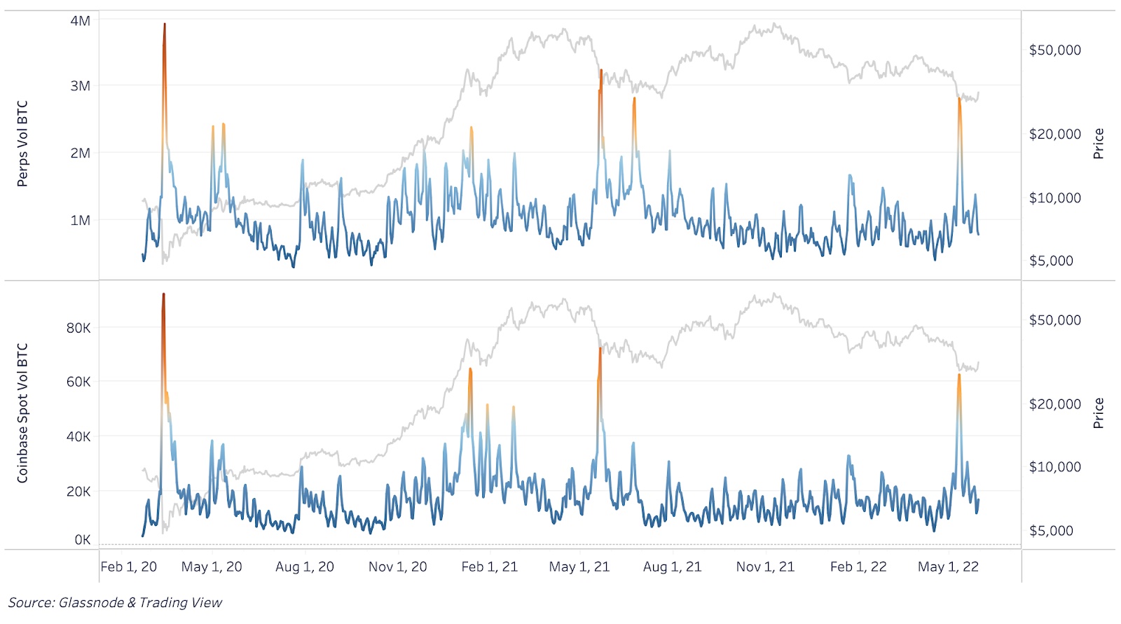 Самая интересная, на наш взгляд, точка данных — это количество монет, сменивших владельца при падении цены. Объем торгов бессрочными свопами достигал уровней, наблюдавшихся только во время падений рынка в марте 2020 и мае 2021 года. Аналогичным образом, и спотовый объем на Coinbase (главной по объему торгов спотовой криптобирже США) достигал уровней, наблюдавшихся лишь трижды в истории.