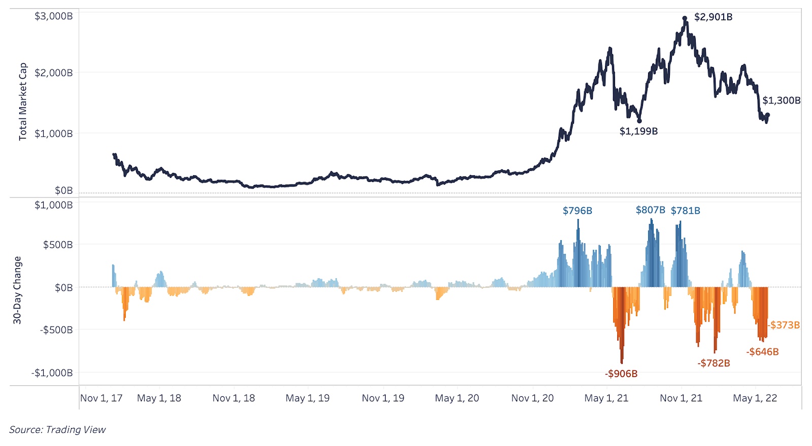 С крахом LUNA / UST и последующей ликвидацией активов многими фондами, общая капитализация крипторынка всего за шесть дней с 7 по 12 мая сократилась на $570 млрд.