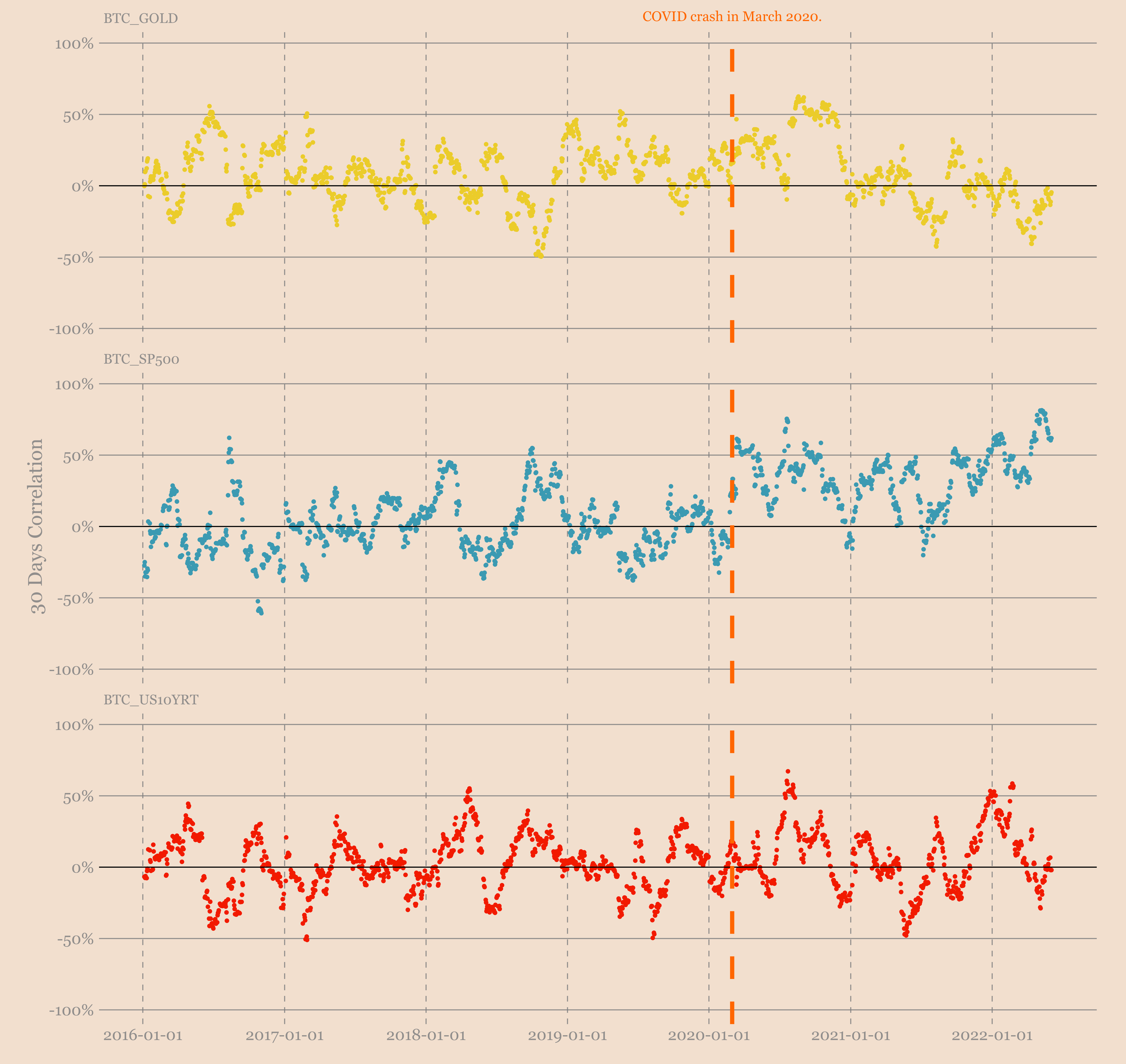 Золото — это эталонный способ сохранения капитала. И хотя биткойн и золото не проявляют никаких признаков корреляции, не будет бесполезно посмотреть, как обычно реагирует золото, чтобы подумать о том, как отреагировал бы биткойн, если бы вёл себя как средство сохранения капитала.